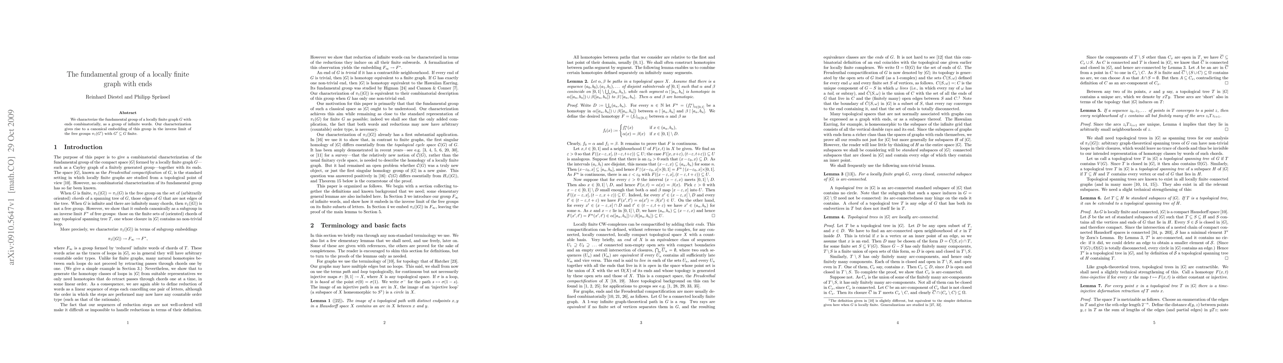We characterize the fundamental group of a locally finite graph G with ends combinatorially, as a group of infinite words. Our characterization gives rise to a canonical embedding of this group in the inverse limit of the (free) fundamental groups of the finite subgraphs of G.