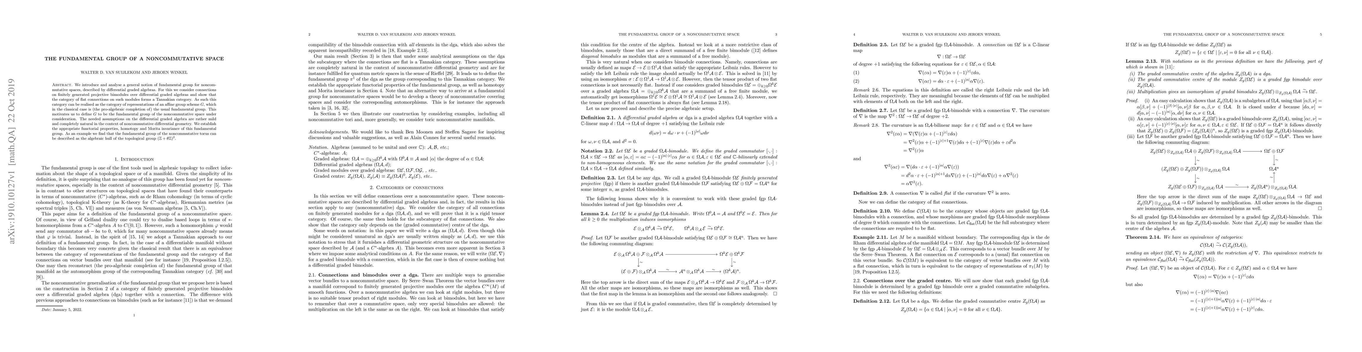 This paper defines a fundamental group for noncommutative spaces via connections on projective bimodules over differential graded algebras, establishing it as an affine group scheme $G$ that retains functorial properties and Morita invariance. The fundamental group of the noncommutative torus is identified as the algebraic hull of $(\mathbb{Z}+\theta \mathbb{Z})^2$.