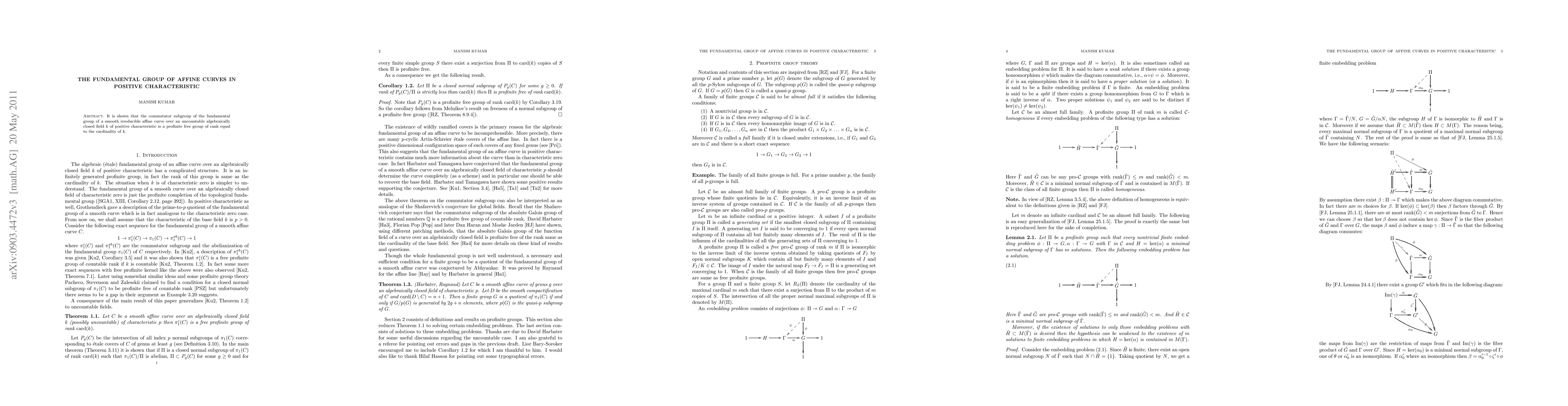 Summary: The paper establishes that the commutator subgroup of the fundamental group of a smooth affine curve in positive characteristic is a profinite free group whose rank matches the cardinality of the underlying field. This result provides insight into the algebraic structure of fundamental groups in positive characteristic settings.