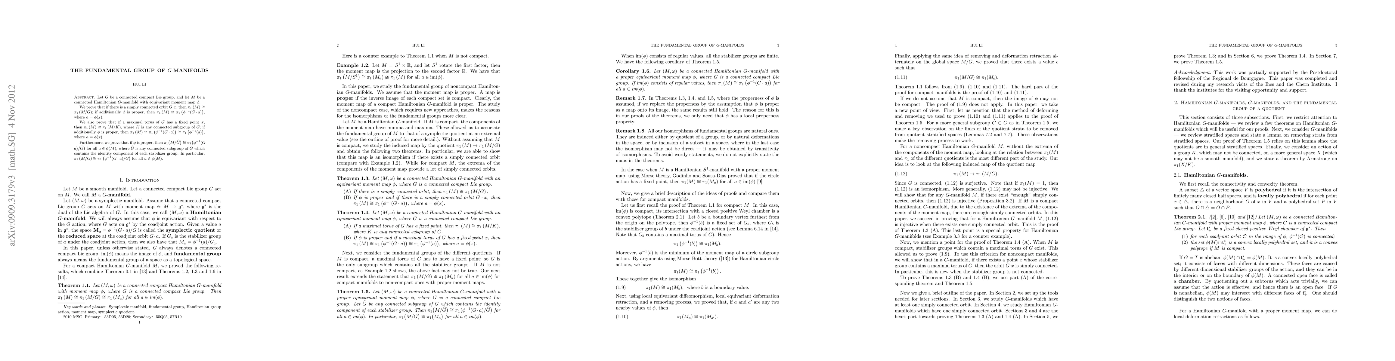 Let $G$ be a connected compact Lie group, and let $M$ be a connected Hamiltonian $G$-manifold with equivariant moment map $\phi$. We prove that if there is a simply connected orbit $G\cdot x$, then $\pi_1(M)\cong\pi_1(M/G)$; if additionally $\phi$ is proper, then $\pi_1(M)\cong\pi_1(\phi^{-1}(G\cdot a))$, where $a=\phi(x)$. We also prove that if a maximal torus of $G$ has a fixed point $x$, then $\pi_1(M)\cong\pi_1(M/K)$, where $K$ is any connected subgroup of $G$; if additionally $\phi$ is proper, then $\pi_1(M)\cong\pi_1(\phi^{-1}(G\cdot a))\cong\pi_1(\phi^{-1}(a))$, where $a=\phi(x)$. Furthermore, we prove that if $\phi$ is proper, then $\pi_1\big(M/\Gh\big)\cong\pi_1\big(\phi^{-1}(G\cdot a)/\Gh\big)$ for all $a\in\phi(M)$, where $\Gh$ is any connected subgroup of $G$ which contains the identity component of each stabilizer group. In particular, $\pi_1(M/G)\cong\pi_1(\phi^{-1}(G\cdot a)/G)$ for all $a\in\phi(M)$.