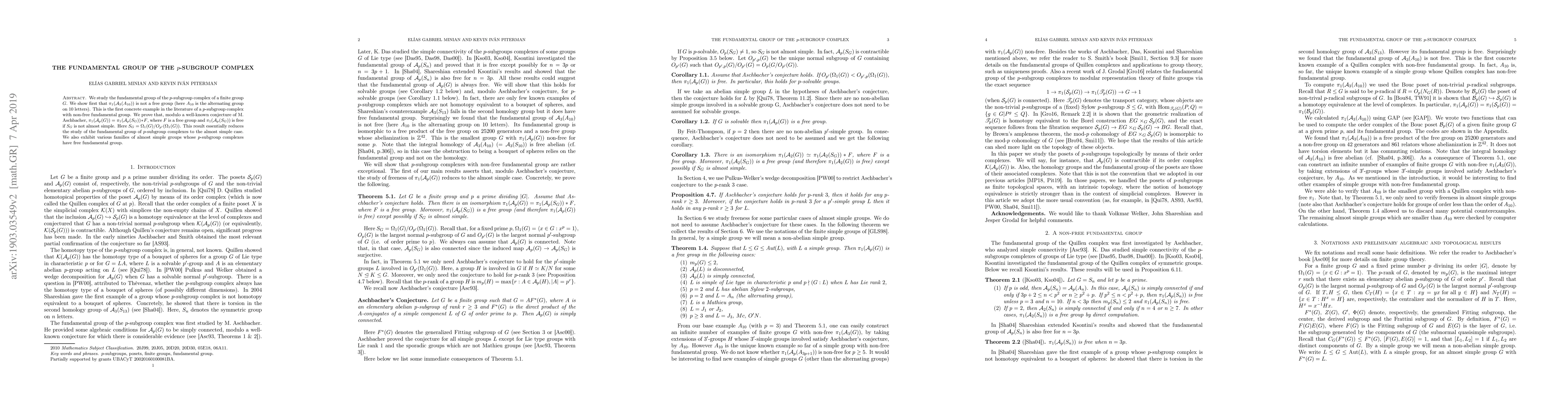 We study the fundamental group of the $p$-subgroup complex of a finite group $G$. We show first that $\pi_1(A_3(A_{10}))$ is not a free group (here $A_{10}$ is the alternating group on $10$ letters). This is the first concrete example in the literature of a $p$-subgroup complex with non-free fundamental group. We prove that, modulo a well-known conjecture of M. Aschbacher, $\pi_1(A_p(G)) = \pi_1(A_p(S_G)) * F$, where $F$ is a free group and $\pi_1(A_p(S_G))$ is free if $S_G$ is not almost simple. Here $S_G = \Omega_1(G)/O_{p'}(\Omega_1(G))$. This result essentially reduces the study of the fundamental group of $p$-subgroup complexes to the almost simple case. We also exhibit various families of almost simple groups whose $p$-subgroup complexes have free fundamental group.