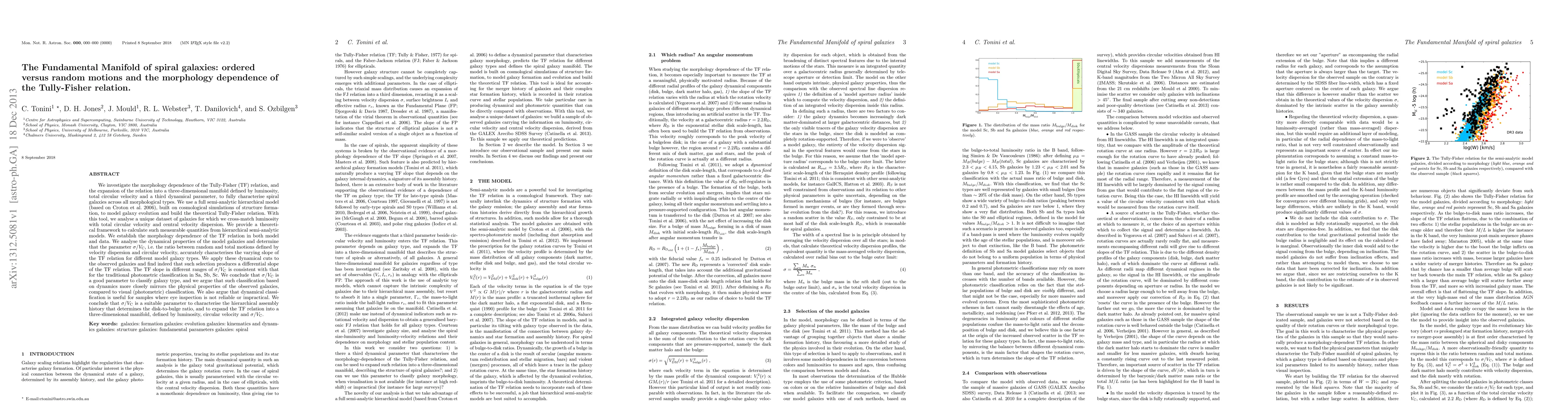 (Abridged) We investigate the morphology dependence of the Tully-Fisher relation, and the expansion of the relation into a three-dimensional manifold defined by luminosity, total circular velocity and a third dynamical parameter, to fully characterise spiral galaxies across all morphological types. We use a semi-analytic hierarchical model of galaxy evolution to build the theoretical TF relation. With this tool, we analyse a unique dataset of galaxies for which we cross-match luminosity with total circular velocity and central velocity dispersion. We provide a theoretical framework to calculate such measurable quantities from semi-analytic models. We establish the morphology dependence of the TF relation in both model and data. We analyse the dynamical properties of the model galaxies and determine that the parameter 'sigma/Vc', i.e. the ratio between random and total motions defined by velocity dispersion and circular velocity, accurately characterises the varying slope of the TF relation for different model galaxy types. We apply these dynamical cuts to the observed galaxies and find that such selection produces a differential slope of the TF relation. The TF slope in different ranges of 'sigma/Vc' is consistent with that for the photometric classification in Sa, Sb, Sc. We conclude that 'sigma/Vc' is a good parameter to classify galaxy type, and we argue that such classification based on dynamics more closely mirrors the physical properties of the observed galaxies, compared to visual classification. We also argue that dynamical classification is useful for samples where eye inspection is not reliable or impractical. We conclude that 'sigma/Vc' is a suitable parameter to characterise the hierarchical assembly history that determines the disk-to-bulge ratio, and to expand the TF relation into a three-dimensional manifold, defined by luminosity, circular velocity and 'sigma/Vc'.