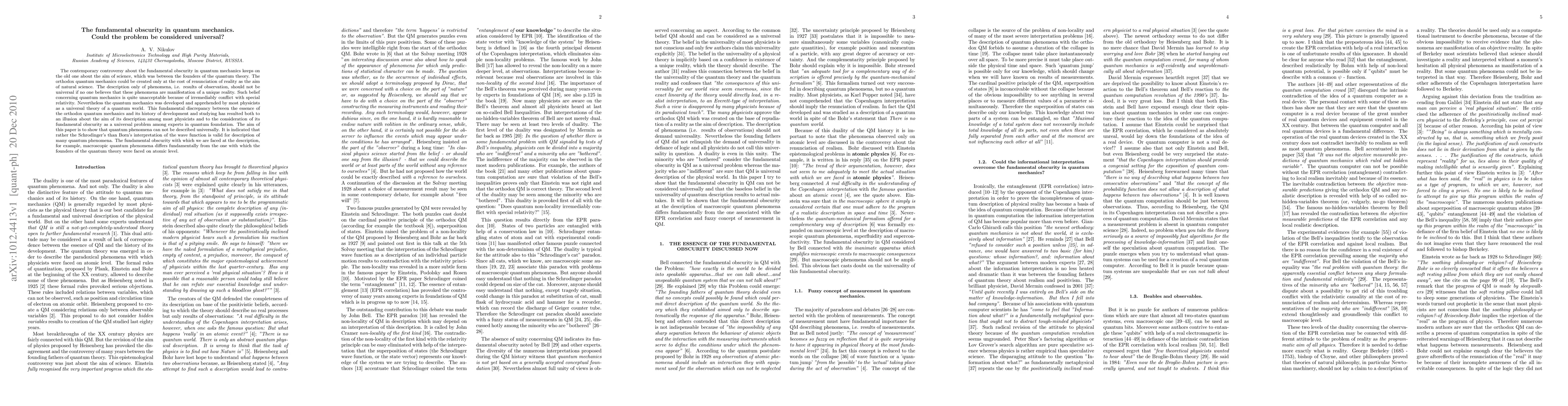 The contemporary controversy about the fundamental obscurity in quantum mechanics keeps on the old one about the aim of science, which was between the founders of the quantum theory. The orthodox quantum mechanics could be created only at the cost of renunciation of reality as the aim of natural science. The description only of phenomena, i.e. results of observation, should not be universal if no one believes that these phenomena are manifestation of a unique reality. Such belief concerning quantum mechanics is quite unacceptable because of irremediably conflict with special relativity. Nevertheless the quantum mechanics was developed and apprehended by most physicists as a universal theory of a quantum world. This fundamental discrepancy between the essence of the orthodox quantum mechanics and its history of development and studying has resulted both to an illusion about the aim of its description among most physicists and to the consideration of its fundamental obscurity as a universal problem among experts in quantum foundation. The aim of this paper is to show that quantum phenomena can not be described universally. It is indicated that rather the Schrodinger's than Born's interpretation of the wave function is valid for description of many quantum phenomena. The fundamental obscurity with which we are faced at the description, for example, macroscopic quantum phenomena differs fundamentally from the one with which the founders of the quantum theory were faced on atomic level.