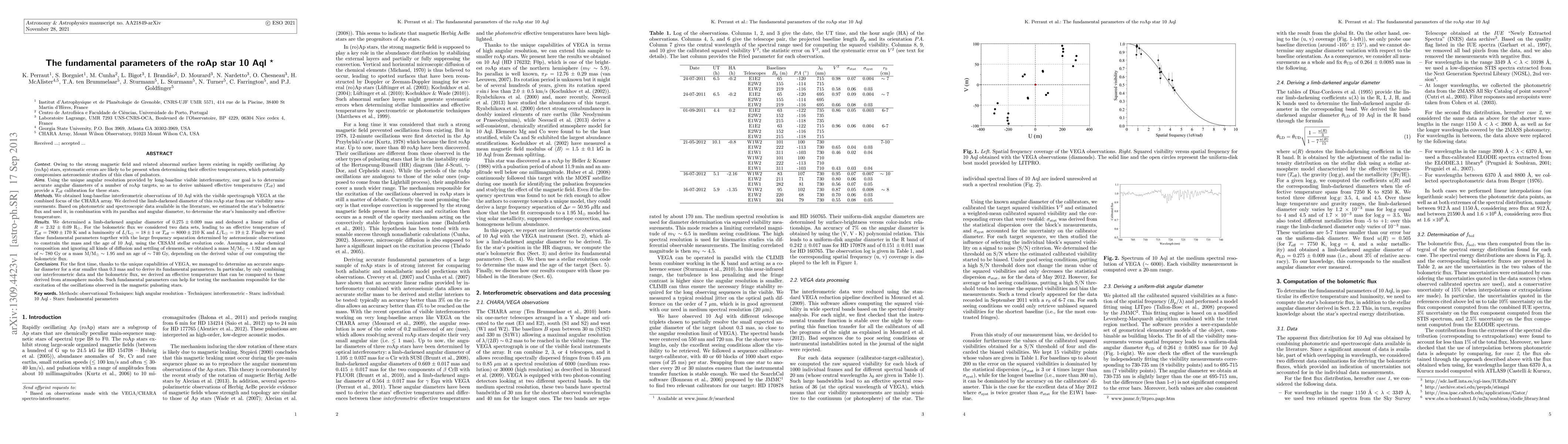 This study uses interferometry to determine the angular diameter and fundamental parameters of the roAp star 10 Aql, finding an effective temperature of 7800-8000 K and a luminosity of 18-19 L_sun. These parameters help constrain the star's mass and age at 1.92-1.95 M_sun and 740-780 Gy, respectively.