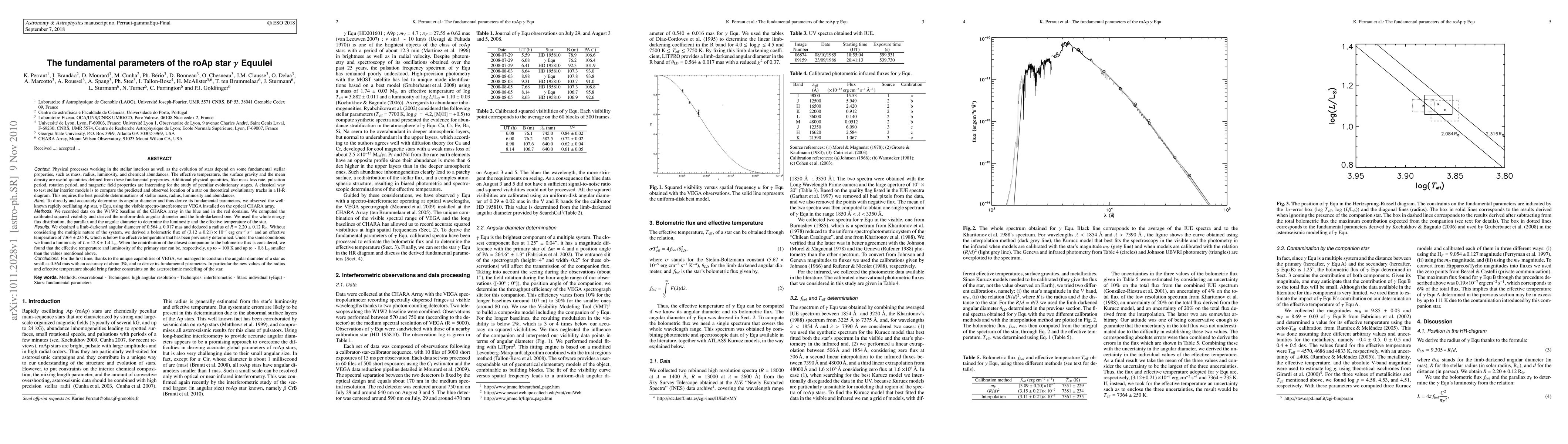 Physical processes working in the stellar interiors as well as the evolution of stars depend on some fundamental stellar properties, such as mass, radius, luminosity, and chemical abundances. A classical way to test stellar interior models is to compare the predicted and observed location of a star on theoretical evolutionary tracks in a H-R diagram. This requires the best possible determinations of stellar mass, radius, luminosity and abundances. To derive its fundamental parameters, we observed the well-known rapidly oscillating Ap star, $\gamma$ Equ, using the visible spectro-interferometer VEGA installed on the optical CHARA array. We computed the calibrated squared visibility and derived the limb-darkened diameter. We used the whole energy flux distribution, the parallax and this angular diameter to determine the luminosity and the effective temperature of the star. We obtained a limb-darkened angular diameter of 0.564~$\pm$~0.017~mas and deduced a radius of $R$~=~2.20~$\pm$~0.12~${\rm R_{\odot}}$. Without considering the multiple nature of the system, we derived a bolometric flux of $(3.12\pm 0.21)\times 10^{-7}$ erg~cm$^{-2}$~s$^{-1}$ and an effective temperature of 7364~$\pm$~235~K, which is below the effective temperature that has been previously determined. Under the same conditions we found a luminosity of $L$~=~12.8~$\pm$~1.4~${\rm L_{\odot}}$. When the contribution of the closest companion to the bolometric flux is considered, we found that the effective temperature and luminosity of the primary star can be, respectively, up to $\sim$~100~K and up to $\sim$~0.8~L$_\odot$ smaller than the values mentioned above.These new values of the radius and effective temperature should bring further constraints on the asteroseismic modelling of the star.