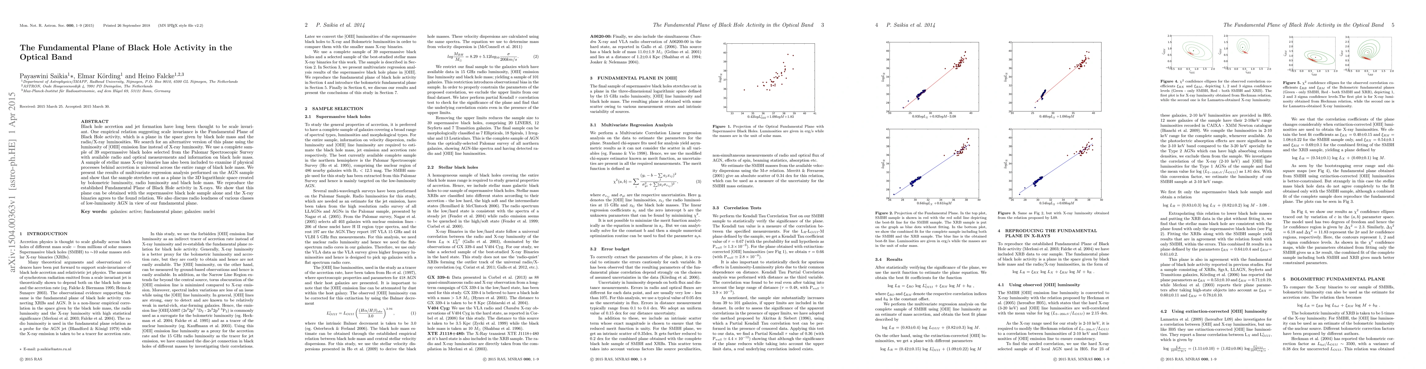 This paper investigates the Fundamental Plane of Black Hole activity using optical [OIII] emission line luminosity instead of X-ray luminosity, confirming the scale invariance of accretion processes across different black hole masses. The study finds a consistent plane in 3D logarithmic space with bolometric, radio, and black hole mass, supporting the universality of accretion mechanisms.