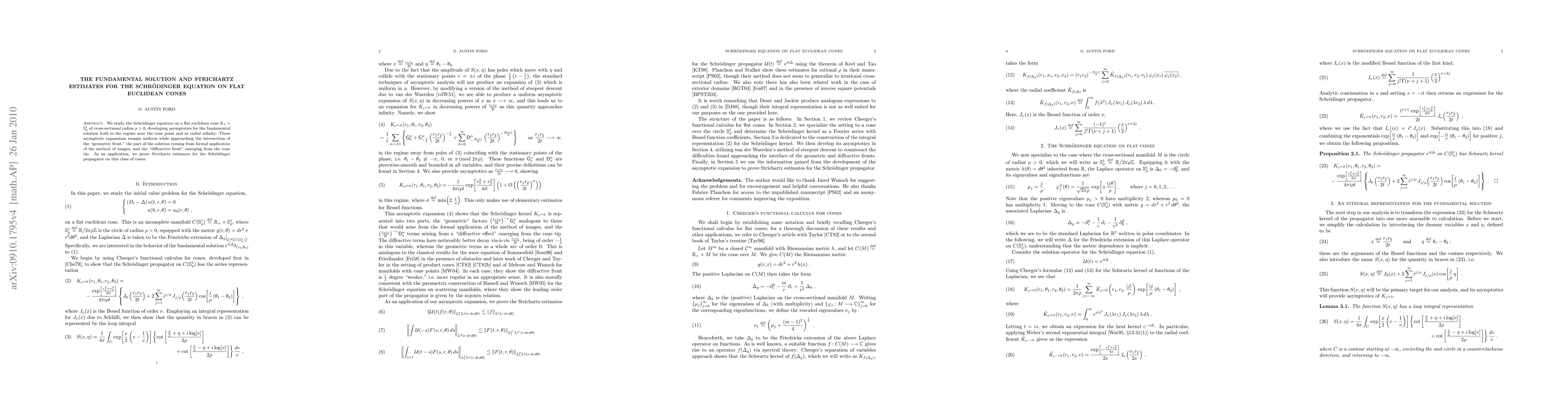 This paper develops asymptotic expansions for the fundamental solution of the Schrödinger equation on flat Euclidean cones, focusing on the behavior near the cone point and at radial infinity. It also proves Strichartz estimates for the Schrödinger propagator on these cones, utilizing the intersection of the geometric and diffractive fronts.