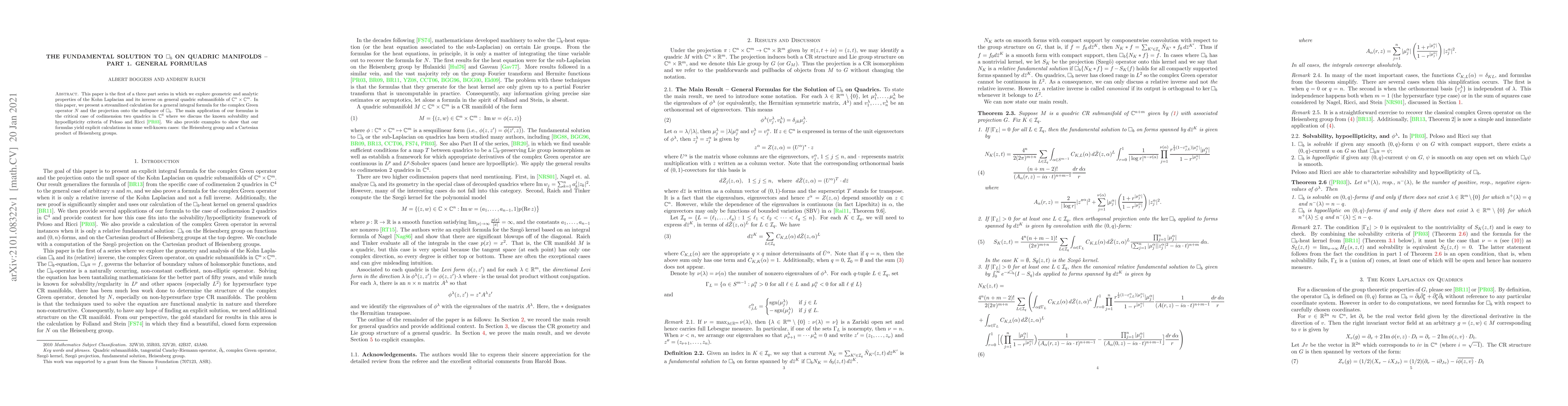 This paper is the first of a three part series in which we explore geometric and analytic properties of the Kohn Laplacian and its inverse on general quadric submanifolds of $\mathbb{C}^n\times\mathbb{C}^m$. In this paper, we present a streamlined calculation for a general integral formula for the complex Green operator $N$ and the projection onto the nullspace of $\Box_b$. The main application of our formulas is the critical case of codimension two quadrics in $\mathbb{C}^4$ where we discuss the known solvability and hypoellipticity criteria of Peloso and Ricci \cite{PeRi03}. We also provide examples to show that our formulas yield explicit calculations in some well-known cases: the Heisenberg group and a Cartesian product of Heisenberg groups.