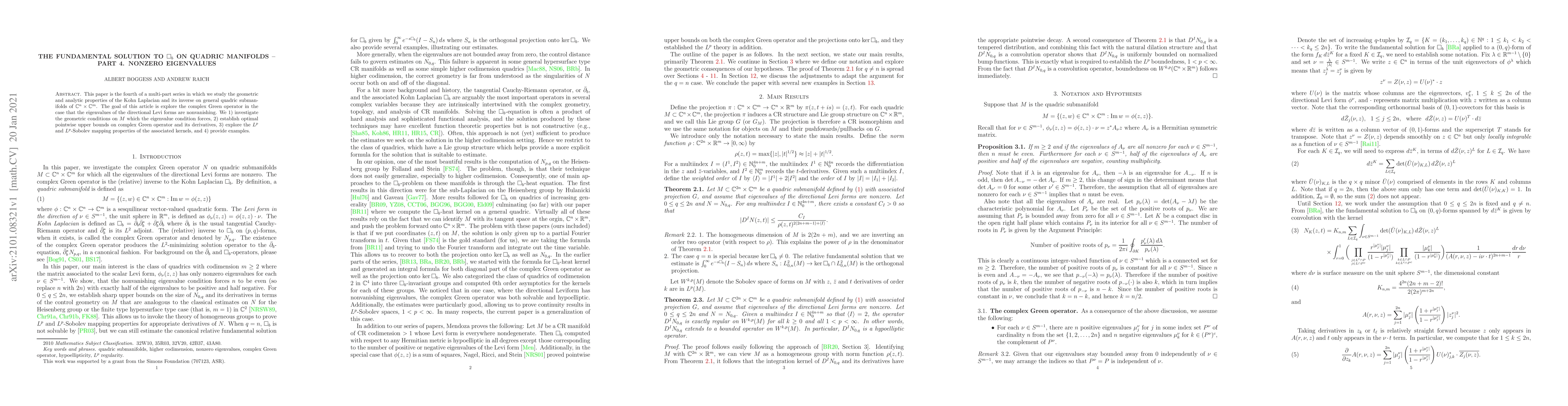 This paper is the fourth of a multi-part series in which we study the geometric and analytic properties of the Kohn Laplacian and its inverse on general quadric submanifolds of $\mathbb{C}^n\times\mathbb{C}^m$. The goal of this article is explore the complex Green operator in the case that the eigenvalues of the directional Levi forms are nonvanishing. We 1) investigate the geometric conditions on $M$ which the eigenvalue condition forces, 2) establish optimal pointwise upper bounds on complex Green operator and its derivatives, 3) explore the $L^p$ and $L^p$-Sobolev mapping properties of the associated kernels, and 4) provide examples.