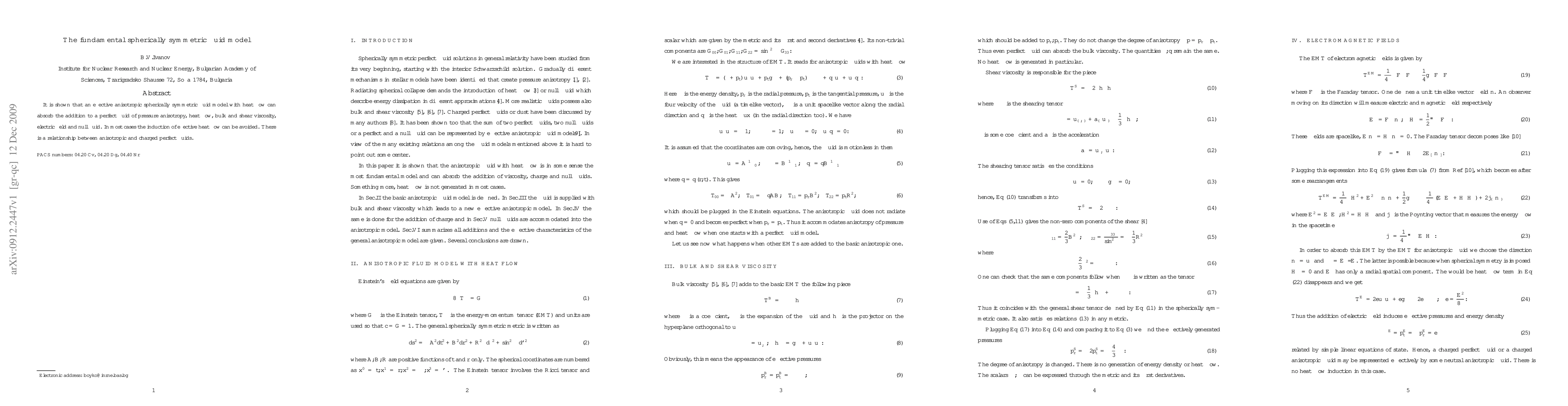 It is shown that an effective anisotropic spherically symmetric fluid model with heat flow can absorb the addition to a perfect fluid of pressure anisotropy, heat flow, bulk and shear viscosity, electric field and null fluid.