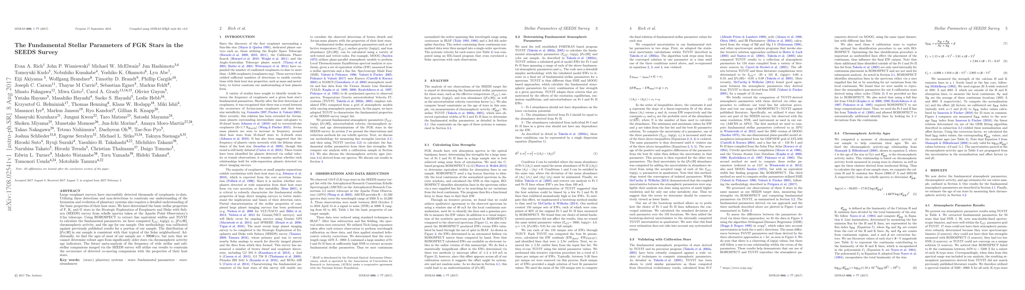 Large exoplanet surveys have successfully detected thousands of exoplanets to-date. Utilizing these detections and non-detections to constrain our understanding of the formation and evolution of planetary systems also requires a detailed understanding of the basic properties of their host stars. We have determined the basic stellar properties of F, K, and G stars in the Strategic Exploration of Exoplanets and Disks with Subaru (SEEDS) survey from echelle spectra taken at the Apache Point Observatory's 3.5m telescope. Using ROBOSPECT to extract line equivalent widths and TGVIT to calculate the fundamental parameters, we have computed Teff, log(g), vt, [Fe/H], chromospheric activity, and the age for our sample. Our methodology was calibrated against previously published results for a portion of our sample. The distribution of [Fe/H] in our sample is consistent with that typical of the Solar neighborhood. Additionally, we find the ages of most of our sample are $< 500 Myrs$, but note that we cannot determine robust ages from significantly older stars via chromospheric activity age indicators. The future meta-analysis of the frequency of wide stellar and sub-stellar companions imaged via the SEEDS survey will utilize our results to constrain the occurrence of detected co-moving companions with the properties of their host stars.