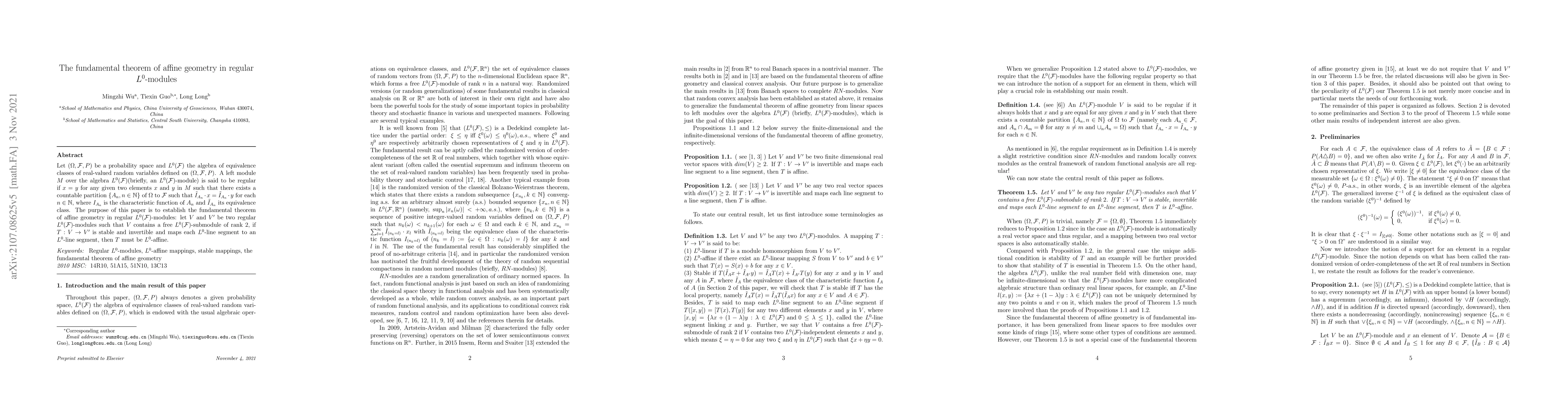 This paper establishes the fundamental theorem of affine geometry in regular $L^0({/mathcal F})$-modules, showing that a stable and invertible map between two modules containing a free submodule of rank 2 must be $L^0$-affine.