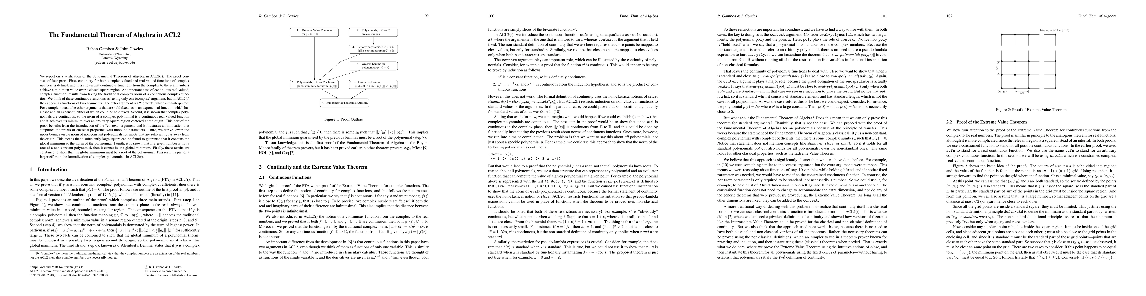 We report on a verification of the Fundamental Theorem of Algebra in ACL2(r). The proof consists of four parts. First, continuity for both complex-valued and real-valued functions of complex numbers is defined, and it is shown that continuous functions from the complex to the real numbers achieve a minimum value over a closed square region. An important case of continuous real-valued, complex functions results from taking the traditional complex norm of a continuous complex function. We think of these continuous functions as having only one (complex) argument, but in ACL2(r) they appear as functions of two arguments. The extra argument is a "context", which is uninterpreted. For example, it could be other arguments that are held fixed, as in an exponential function which has a base and an exponent, either of which could be held fixed. Second, it is shown that complex polynomials are continuous, so the norm of a complex polynomial is a continuous real-valued function and it achieves its minimum over an arbitrary square region centered at the origin. This part of the proof benefits from the introduction of the "context" argument, and it illustrates an innovation that simplifies the proofs of classical properties with unbound parameters. Third, we derive lower and upper bounds on the norm of non-constant polynomials for inputs that are sufficiently far away from the origin. This means that a sufficiently large square can be found to guarantee that it contains the global minimum of the norm of the polynomial. Fourth, it is shown that if a given number is not a root of a non-constant polynomial, then it cannot be the global minimum. Finally, these results are combined to show that the global minimum must be a root of the polynomial. This result is part of a larger effort in the formalization of complex polynomials in ACL2(r).