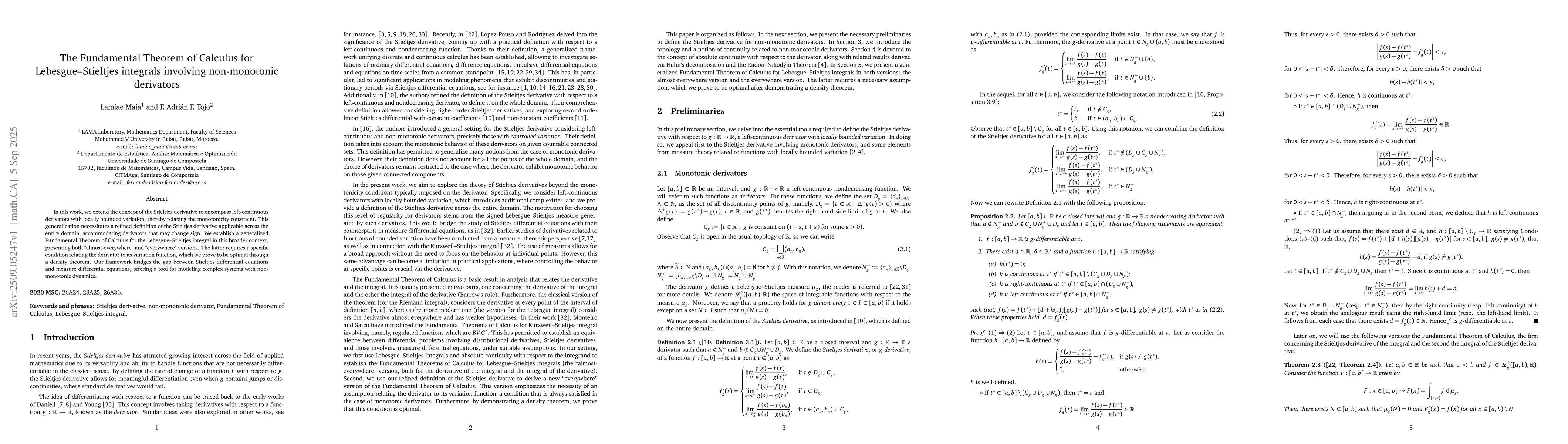 In this work, we extend the concept of the Stieltjes derivative to encompass left-continuous derivators with locally bounded variation, thereby relaxing the monotonicity constraint. This generalization necessitates a refined definition of the Stieltjes derivative applicable across the entire domain, accommodating derivators that may change sign. We establish a generalized Fundamental Theorem of Calculus for the Lebesgue-Stieltjes integral in this broader context, presenting both "almost-everywhere" and "everywhere" versions. The latter requires a specific condition relating the derivator to its variation function, which we prove to be optimal through a density theorem. Our framework bridges the gap between Stieltjes differential equations and measure differential equations, offering a tool for modeling complex systems with non-monotonic dynamics.