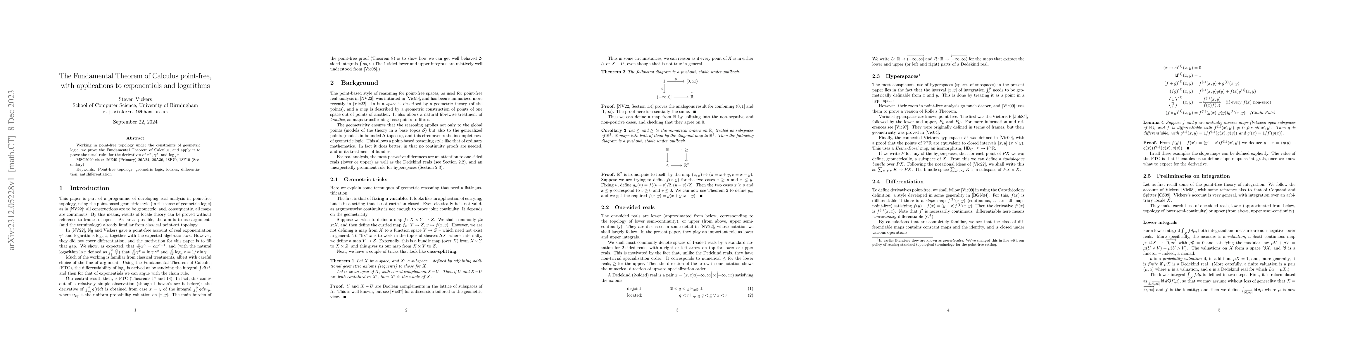 Summary: This paper proves the Fundamental Theorem of Calculus within the framework of point-free topology and geometric logic, and applies this theorem to derive the standard derivative rules for $x^\alpha$, $\gamma^x$, and $\log_\gamma x$.