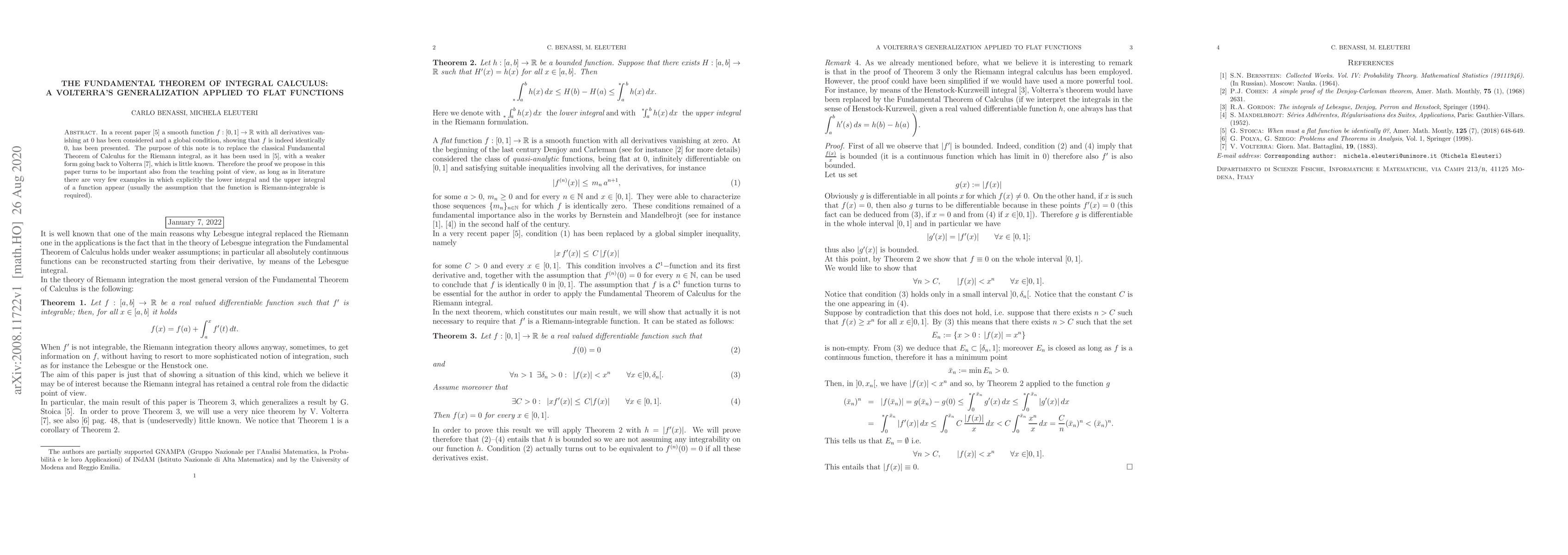 This paper presents a generalization of the Fundamental Theorem of Calculus using Volterra's weaker form, applied to "flat functions" where all derivatives vanish at 0. It emphasizes the importance of explicitly considering the lower and upper integrals, which is less common in literature.