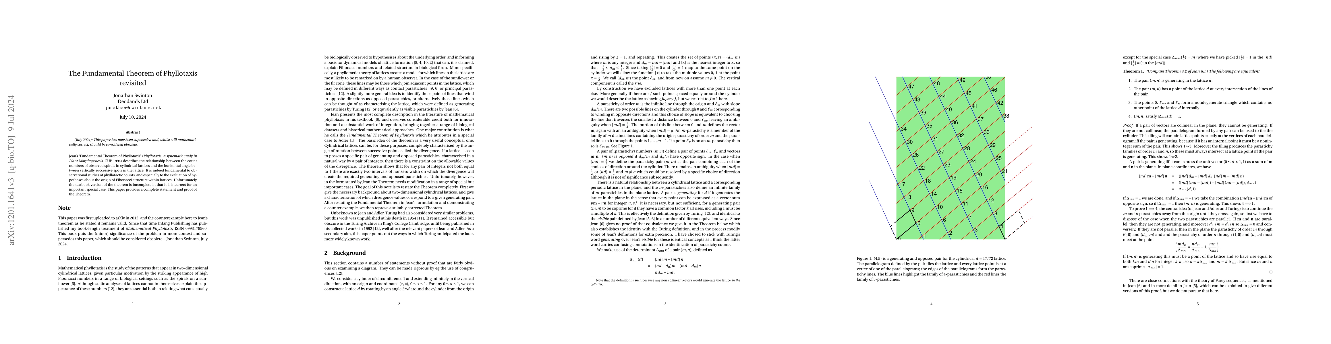 This paper corrects and completes Jean's "Fundamental Theorem of Phyllotaxis," addressing its incompleteness in special cases and providing a full proof for the relationship between spiral counts in cylindrical lattices and the horizontal angle between spots.