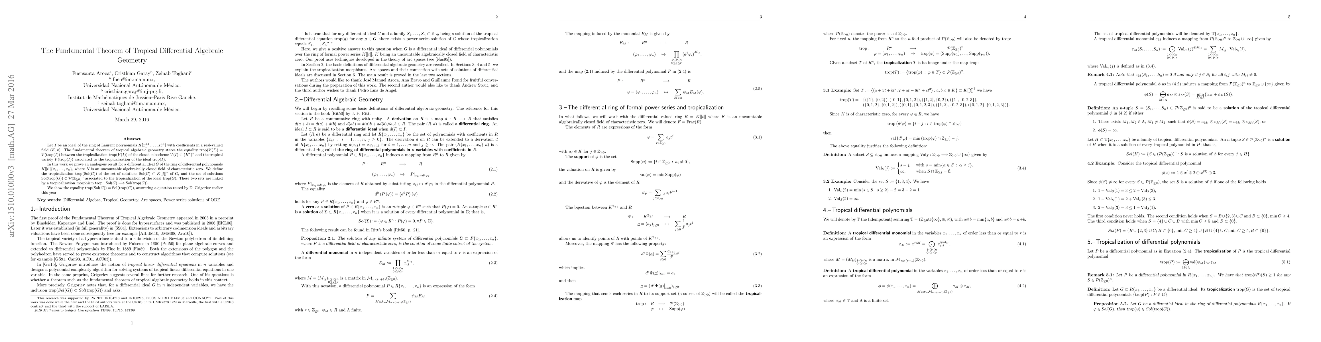 Let $I$ be an ideal of the ring of Laurent polynomials $K[x_1^{\pm1},\ldots,x_n^{\pm1}]$ with coefficients in a real-valued field $(K,v)$. The fundamental theorem of tropical algebraic geometry states the equality $\text{trop}(V(I))=V(\text{trop}(I))$ between the tropicalization $\text{trop}(V(I))$ of the closed subscheme $V(I)\subset (K^*)^n$ and the tropical variety $V(\text{trop}(I))$ associated to the tropicalization of the ideal $\text{trop}(I)$. In this work we prove an analogous result for a differential ideal $G$ of the ring of differential polynomials $K[[t]]\{x_1,\ldots,x_n\}$, where $K$ is an uncountable algebraically closed field of characteristic zero. We define the tropicalization $\text{trop}(\text{Sol}(G))$ of the set of solutions $\text{Sol}(G)\subset K[[t]]^n$ of $G$, and the set of solutions associated to the tropicalization of the ideal $\text{trop}(G)$. These two sets are linked by a tropicalization morphism $\text{trop}:\text{Sol}(G)\longrightarrow \text{Sol}(\text{trop}(G))$. We show the equality $\text{trop}(\text{Sol}(G))=\text{Sol}(\text{trop}(G))$, answering a question raised by D. Grigoriev earlier this year.