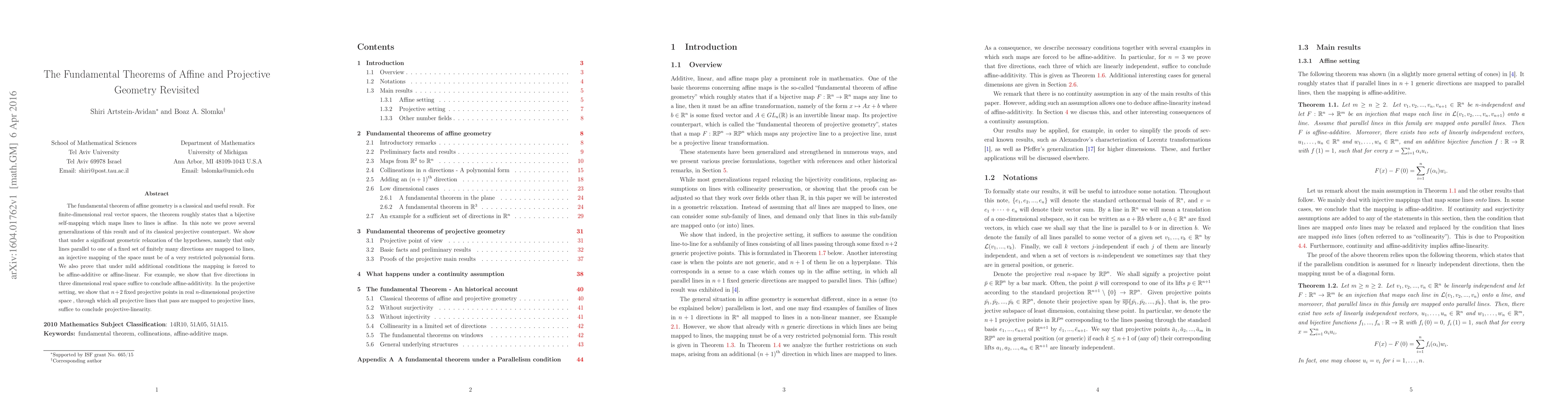 The fundamental theorem of affine geometry is a classical and useful result. For finite-dimensional real vector spaces, the theorem roughly states that a bijective self-mapping which maps lines to lines is affine. In this note we prove several generalizations of this result and of its classical projective counterpart. We show that under a significant geometric relaxation of the hypotheses, namely that only lines parallel to one of a fixed set of finitely many directions are mapped to lines, an injective mapping of the space must be of a very restricted polynomial form. We also prove that under mild additional conditions the mapping is forced to be affine-additive or affine-linear. For example, we show that five directions in three dimensional real space suffice to conclude affine-additivity. In the projective setting, we show that n+2 fixed projective points in real n-dimensional projective space , through which all projective lines that pass are mapped to projective lines, suffice to conclude projective-linearity.
