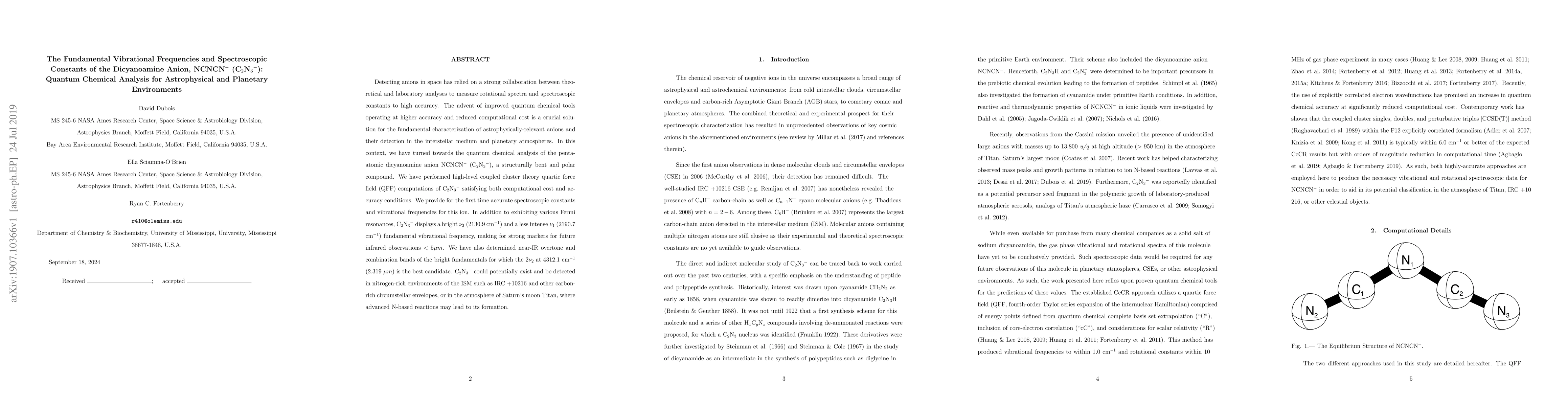 Detecting anions in space has relied on a strong collaboration between theoretical and laboratory analyses to measure rotational spectra and spectroscopic constants to high accuracy. The advent of improved quantum chemical tools operating at higher accuracy and reduced computational cost is a crucial solution for the fundamental characterization of astrophysically-relevant anions and their detection in the interstellar medium and planetary atmospheres. In this context, we have turned towards the quantum chemical analysis of the penta-atomic dicyanoamine anion NCNCN$^-$ (C$_2$N$_3^-$), a structurally bent and polar compound. We have performed high-level coupled cluster theory quartic force field (QFF) computations of C$_2$N$_3^-$ satisfying both computational cost and accuracy conditions. We provide for the first time accurate spectroscopic constants and vibrational frequencies for this ion. In addition to exhibiting various Fermi resonances, C$_2$N$_3^-$ displays a bright $\nu$2 (2130.9 cm$^{-1}$) and a less intense $\nu$1 (2190.7 cm$^{-1}$) fundamental vibrational frequency, making for strong markers for future infrared observations < 5$\mu$m. We have also determined near-IR overtone and combination bands of the bright fundamentals for which the 2$\nu$2 at 4312.1 cm$^{-1}$ (2.319 $\mu$m) is the best candidate. C$_2$N$_3^-$ could potentially exist and be detected in nitrogen-rich environments of the ISM such as IRC +10216 and other carbon-rich circumstellar envelopes, or in the atmosphere of Saturn's moon Titan, where advanced N-based reactions may lead to its formation.