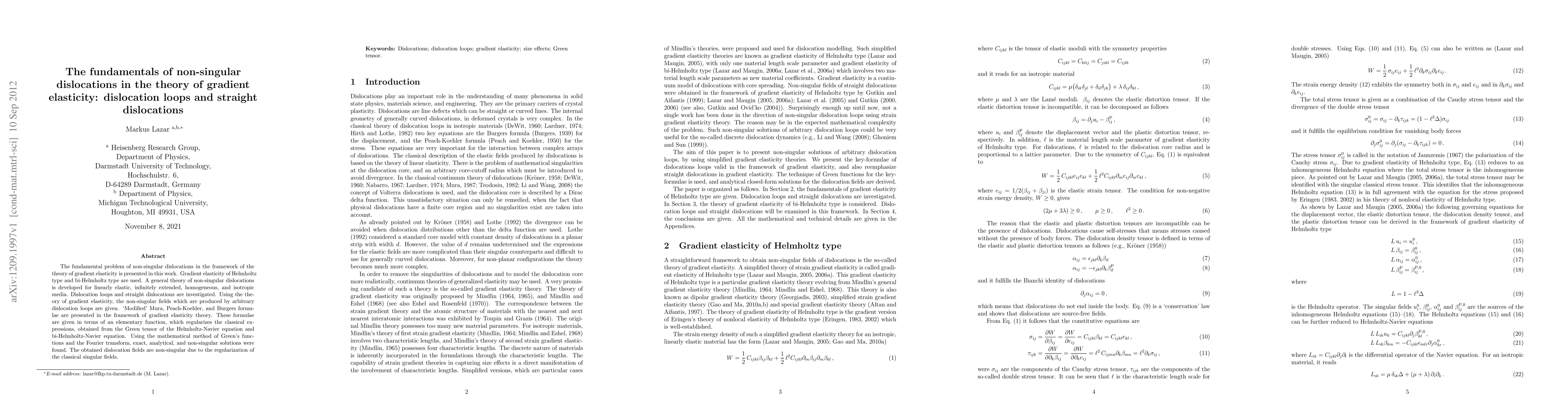 This paper develops a general theory of non-singular dislocations in gradient elasticity, focusing on Helmholtz and bi-Helmholtz types. It presents modified classical formulae and exact, analytical, non-singular solutions for dislocation loops and straight dislocations using Green's functions and Fourier transforms.