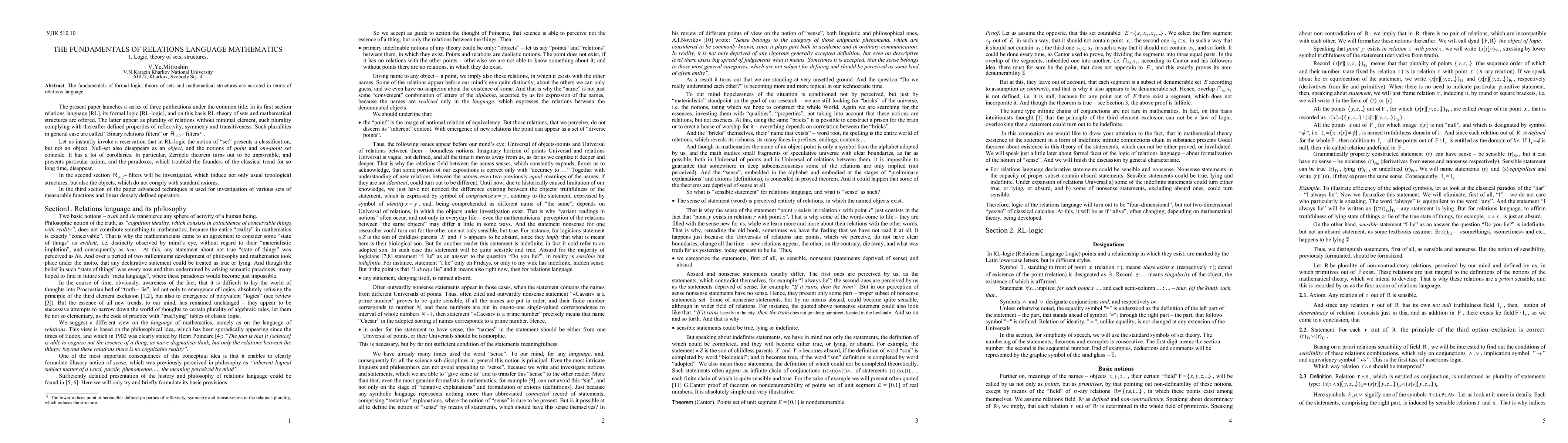 Summary: This paper explores the foundational aspects of formal logic, set theory, and mathematical structures through the lens of relations language, providing a comprehensive framework for understanding these mathematical concepts.