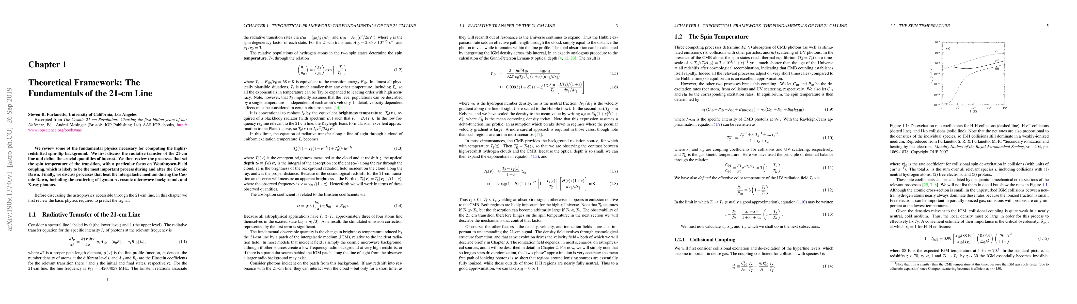 We review some of the fundamental physics necessary for computing the highly-redshifted spin-flip background. We first discuss the radiative transfer of the 21-cm line and define the crucial quantities of interest. We then review the processes that set the spin temperature of the transition, with a particular focus on Wouthuysen-Field coupling, which is likely to be the most important process during and after the Cosmic Dawn. Finally, we discuss processes that heat the intergalactic medium during the Cosmic Dawn, including the scattering of Lyman-alpha, cosmic microwave background, and X-ray photons.