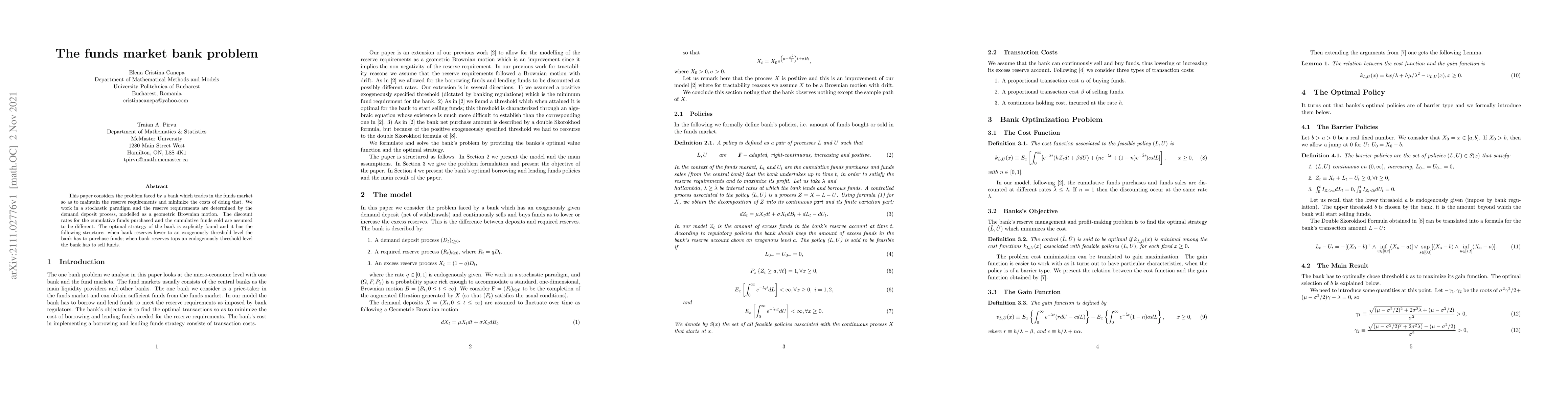 This paper identifies the optimal strategy for a bank to manage its funds market trading, balancing reserve requirements and cost minimization. The bank's optimal strategy involves purchasing funds when reserves fall below an exogenous threshold and selling funds when reserves exceed an endogenously determined threshold.