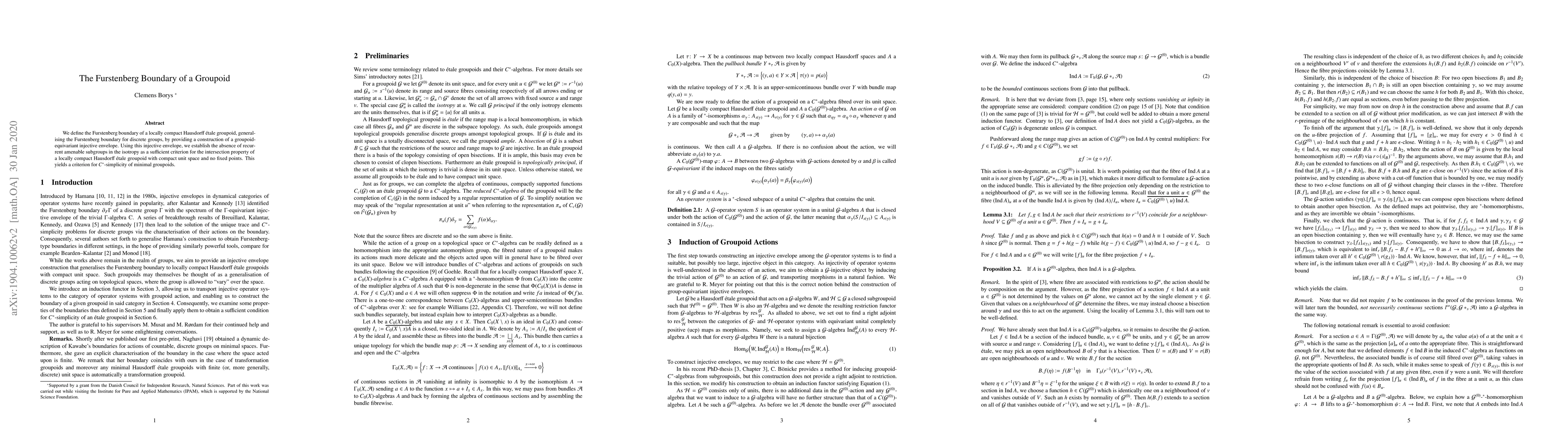 The paper defines the Furstenberg boundary for a locally compact Hausdorff \'etale groupoid, generalizing the concept from discrete groups. It establishes criteria for C*-simplicity of minimal groupoids by showing the absence of recurrent amenable subgroups in the isotropy.