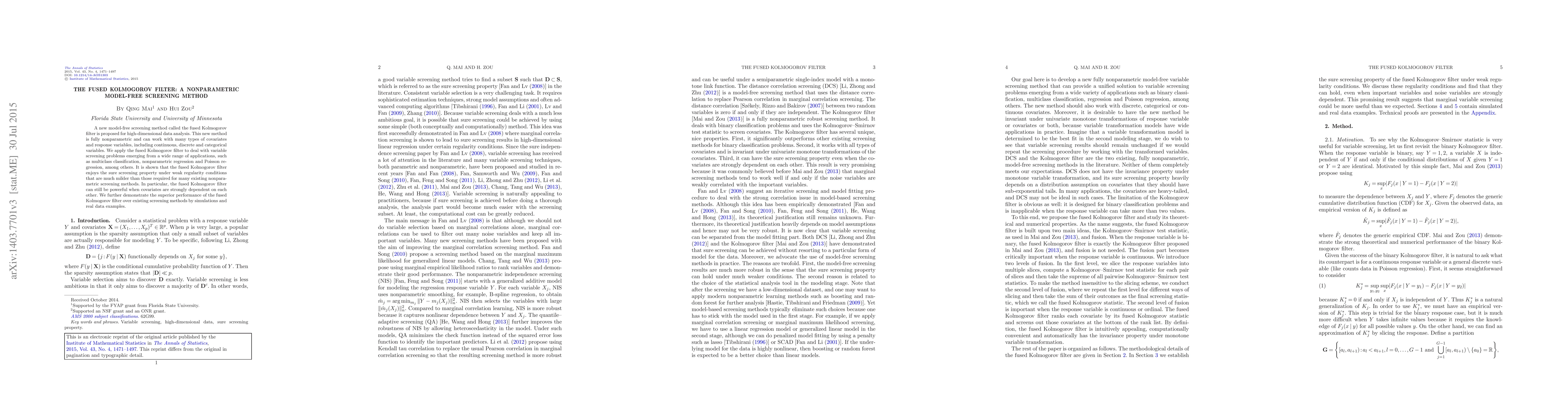 A new model-free screening method called the fused Kolmogorov filter is proposed for high-dimensional data analysis. This new method is fully nonparametric and can work with many types of covariates and response variables, including continuous, discrete and categorical variables. We apply the fused Kolmogorov filter to deal with variable screening problems emerging from a wide range of applications, such as multiclass classification, nonparametric regression and Poisson regression, among others. It is shown that the fused Kolmogorov filter enjoys the sure screening property under weak regularity conditions that are much milder than those required for many existing nonparametric screening methods. In particular, the fused Kolmogorov filter can still be powerful when covariates are strongly dependent on each other. We further demonstrate the superior performance of the fused Kolmogorov filter over existing screening methods by simulations and real data examples.