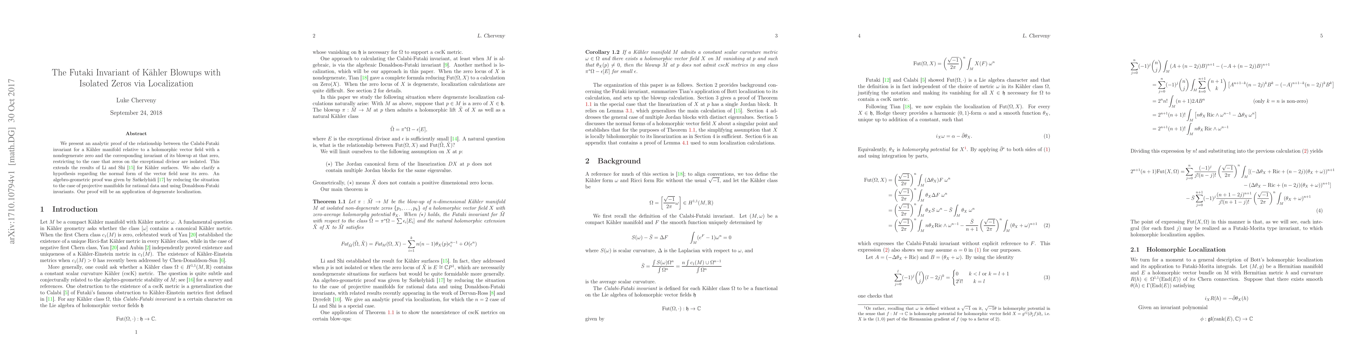 This paper presents an analytic proof of the relationship between the Calabi-Futaki invariant for Kähler manifolds and their blowups at isolated zeros of holomorphic vector fields, extending previous results for Kähler surfaces. The method uses degenerate localization to clarify the invariant's behavior.