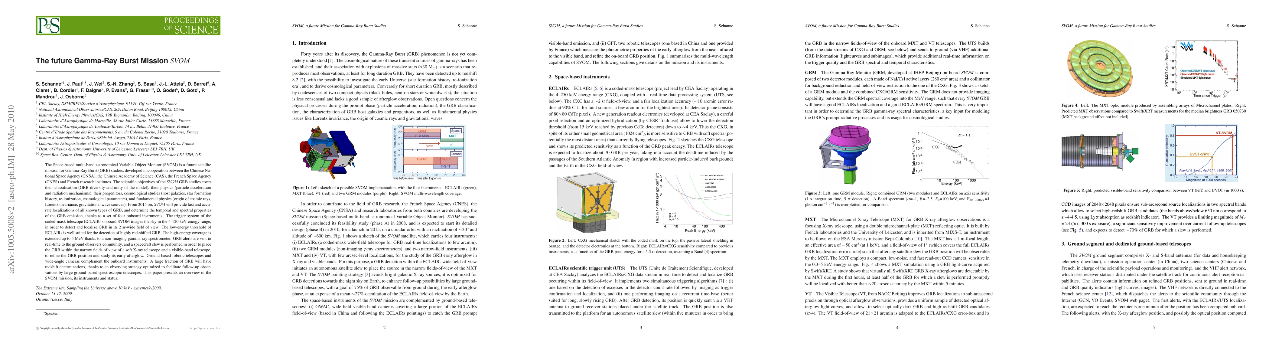 The SVOM mission, a collaborative satellite project by CNSA, CAS, CNES, and French research institutes, aims to study Gamma-Ray Bursts (GRB) through classification, physics, progenitors, and cosmological parameters. The mission will use a coded-mask telescope and other instruments to provide fast GRB localizations and detailed spectral analysis.