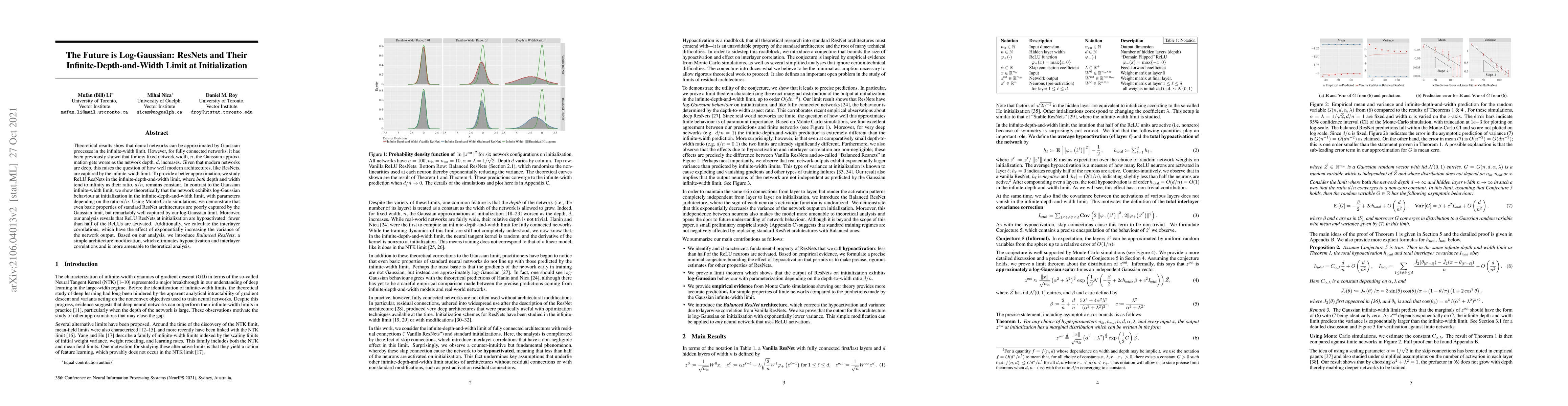 This paper theoretically investigates the behavior of ReLU ResNets in the infinite-depth-and-width limit, demonstrating that they exhibit log-Gaussian behavior at initialization, contrasting with the Gaussian approximation. Monte Carlo simulations show that the log-Gaussian limit better captures ResNet properties than the Gaussian limit, revealing hypoactivation and interlayer correlations in standard ResNets.