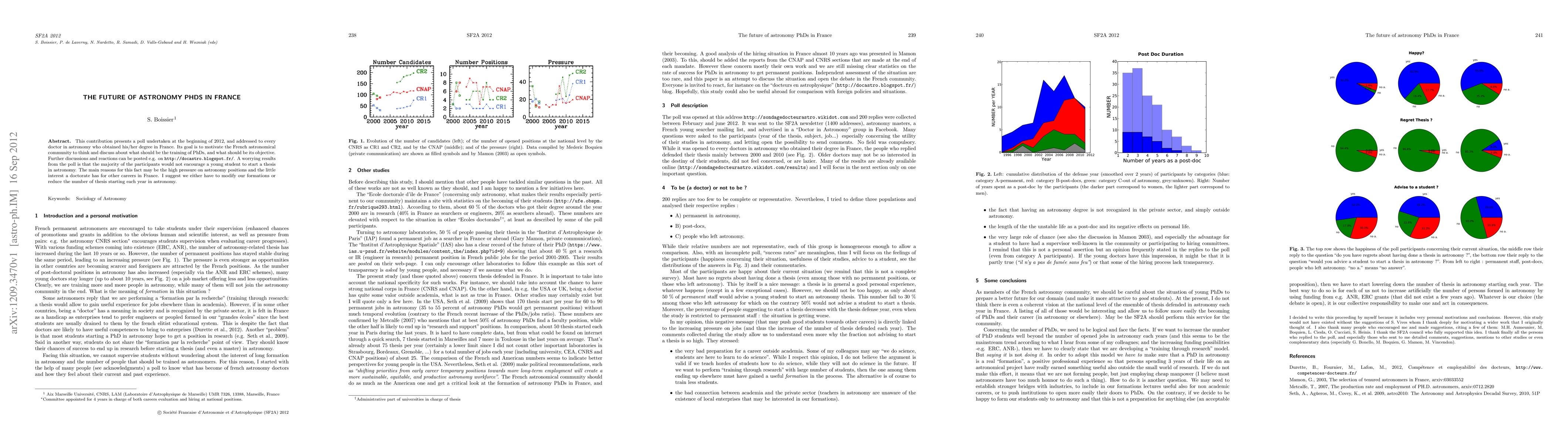 This contribution presents a poll undertaken at the beginning of 2012, and addressed to every doctor in astronomy who obtained his/her degree in France. Its goal is to motivate the French astronomical community to think and discuss about what should be the training of PhDs, and what should be its objective. Further discussions and reactions can be posted e.g. on http://docastro.blogspot.fr/. A worrying results from the poll is that the majority of the participants would not encourage a young student to start a thesis in astronomy. The main reasons for this fact may be the high pressure on astronomy positions and the little interest a doctorate has for other careers in France. I suggest we either have to modify our formations or reduce the number of thesis starting each year in astronomy.