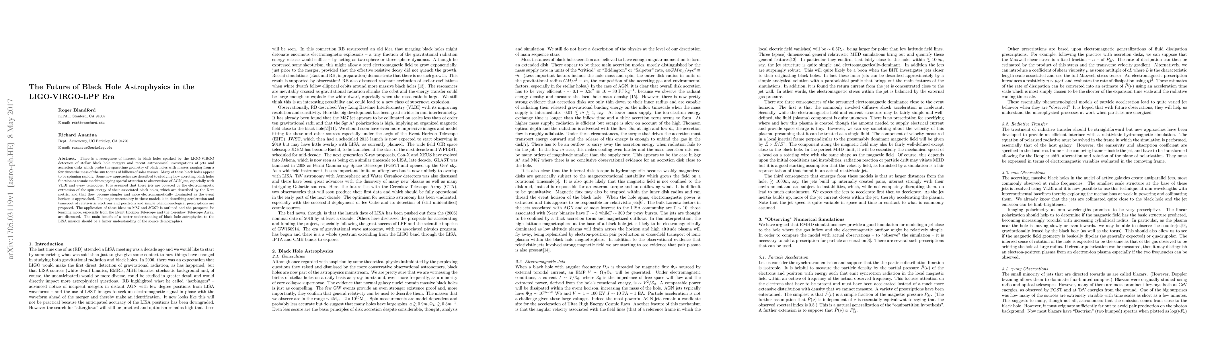 There is a resurgence of interest in black holes sparked by the LIGO-VIRGO detection of stellar black hole mergers and recent astronomical investigations of jets and accretion disks which probe the spacetime geometry of black holes with masses ranging from a few times the mass of the sun to tens of billions of solar masses. Many of these black holes appear to be spinning rapidly. Some new approaches are described to studying how accreting black holes function as cosmic machines paying special attention to observations of AGN jets, especially with VLBI and $\gamma$-ray telescopes. It is assumed that these jets are powered by the electromagnetic extraction of the spin energy of their associated black holes, which are described by the Kerr metric, and that they become simpler and more electromagnetically dominated as the event horizon is approached. The major uncertainty in these models is in describing acceleration and transport of relativistic electrons and positrons and simple phenomenological prescriptions are proposed. The application of these ideas to M87 and 3C279 is outlined and the prospects for learning more, especially from the Event Horizon Telescope and the Cerenkov Telescope Array, are discussed. The main benefit of a better understanding of black hole astrophysics to the LISA mission should be a firmer understanding of the source demographics.