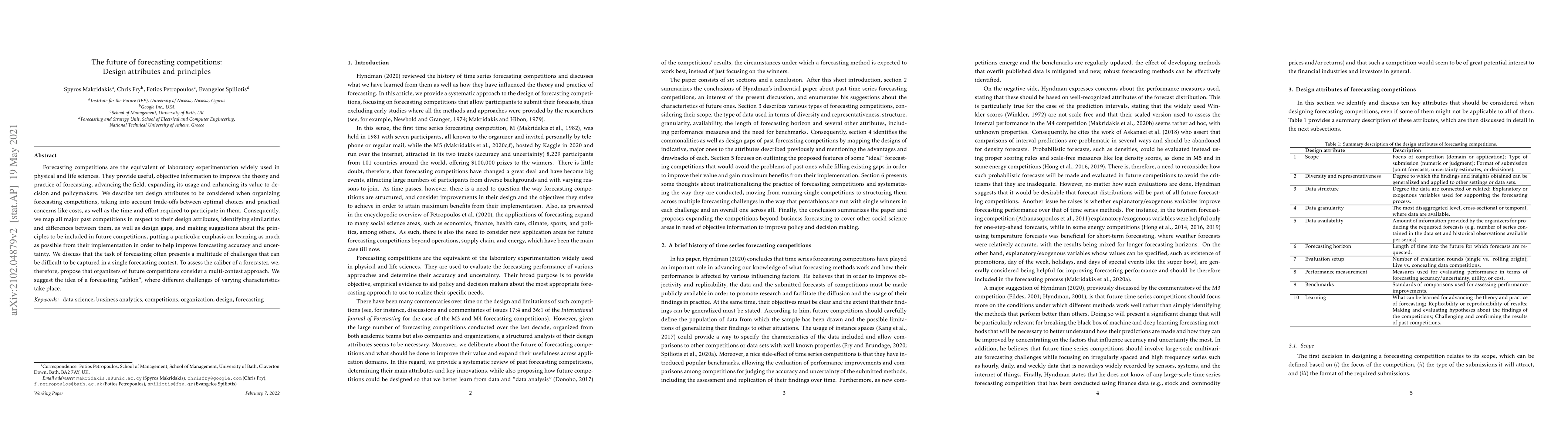 Forecasting competitions are the equivalent of laboratory experimentation widely used in physical and life sciences. They provide useful, objective information to improve the theory and practice of forecasting, advancing the field, expanding its usage and enhancing its value to decision and policymakers. We describe ten design attributes to be considered when organizing forecasting competitions, taking into account trade-offs between optimal choices and practical concerns like costs, as well as the time and effort required to participate in them. Consequently, we map all major past competitions in respect to their design attributes, identifying similarities and differences between them, as well as design gaps, and making suggestions about the principles to be included in future competitions, putting a particular emphasis on learning as much as possible from their implementation in order to help improve forecasting accuracy and uncertainty. We discuss that the task of forecasting often presents a multitude of challenges that can be difficult to be captured in a single forecasting contest. To assess the caliber of a forecaster, we, therefore, propose that organizers of future competitions consider a multi-contest approach. We suggest the idea of a forecasting "athlon", where different challenges of varying characteristics take place.