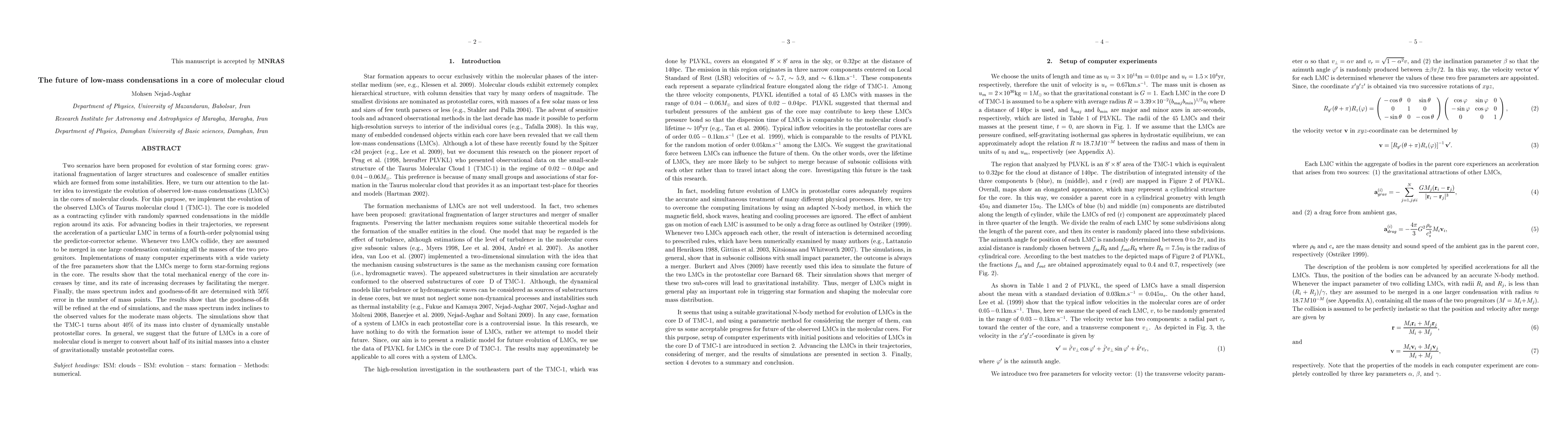 Two scenarios have been proposed for evolution of star forming cores: gravitational fragmentation of larger structures and coalescence of smaller entities which are formed from some instabilities. Here, we turn our attention to the latter idea to investigate the evolution of observed low-mass condensations (LMCs) in the cores of molecular clouds. For this purpose, we implement the evolution of the observed LMCs of Taurus molecular cloud~1 (TMC-1). The core is modeled as a contracting cylinder with randomly spawned condensations in the middle region around its axis. For advancing bodies in their trajectories, we represent the acceleration of a particular LMC in terms of a fourth-order polynomial using the predictor-corrector scheme. Whenever two LMCs collide, they are assumed to be merged in one large condensation containing all the masses of the two progenitors. Implementations of many computer experiments with a wide variety of the free parameters show that the LMCs merge to form star-forming regions in the core. The results show that the total mechanical energy of the core increases by time, and its rate of increasing decreases by facilitating the merger. Finally, the mass spectrum index and goodness-of-fit are determined with 50% error in the number of mass points. The results show that the goodness-of-fit will be refined at the end of simulations, and the mass spectrum index inclines to the observed values for the moderate mass objects. The simulations show that the TMC-1 turns about 40% of its mass into cluster of dynamically unstable protostellar cores. In general, we suggest that the future of LMCs in a core of molecular cloud is merger to convert about half of its initial masses into a cluster of gravitationally unstable protostellar cores.