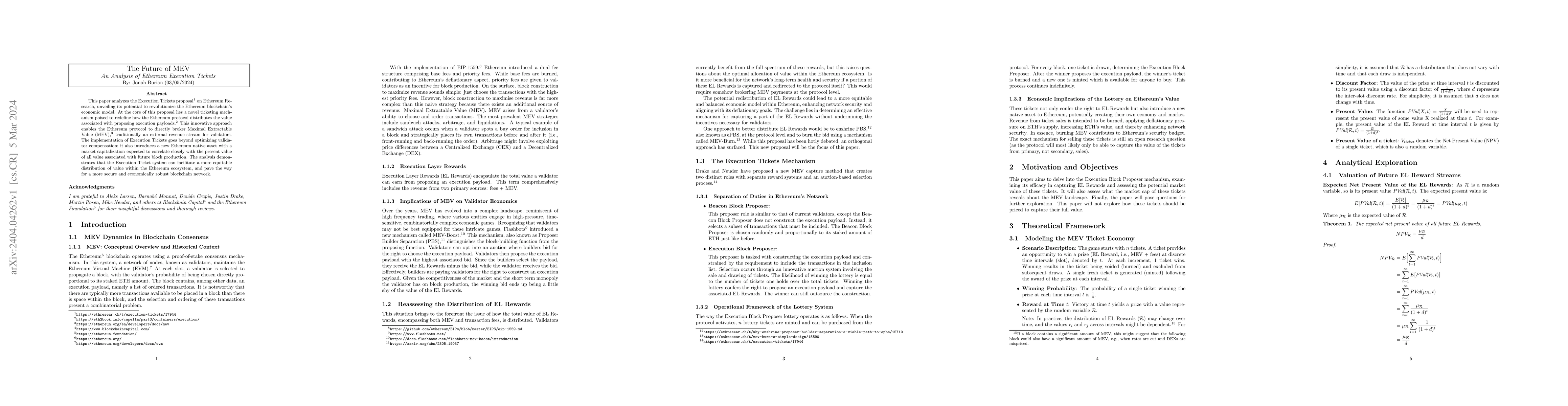 The paper explores the Execution Tickets proposal to revolutionize Ethereum's economic model by introducing a novel ticketing mechanism for brokering Maximal Extractable Value (MEV) directly within the protocol, potentially leading to a more equitable and secure blockchain network. The Execution Tickets system aims to optimize validator compensation and introduce a new native Ethereum asset whose value is tied to future block production.