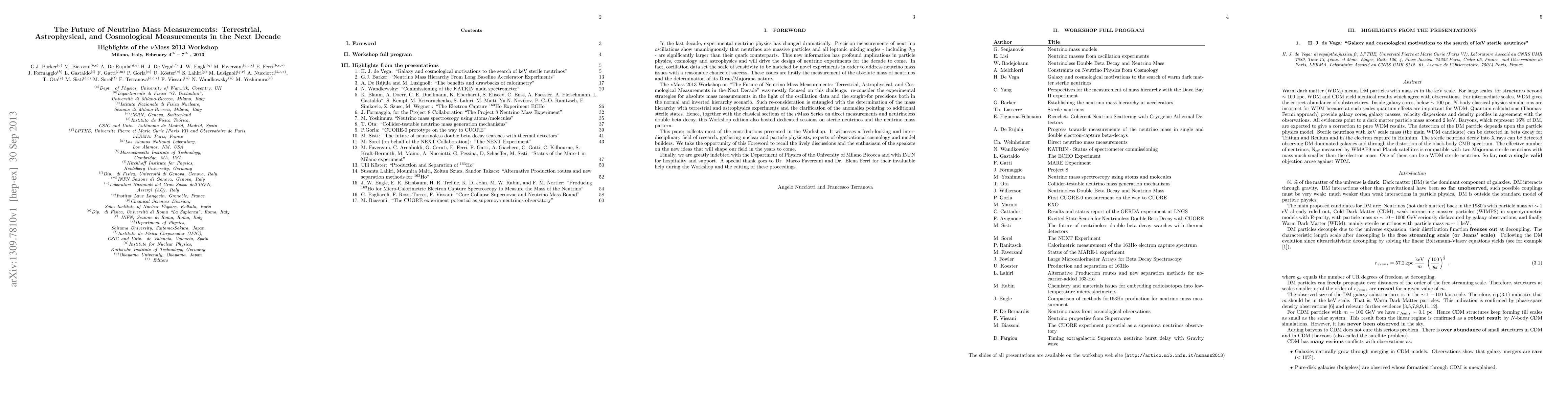 The third Workshop of the NuMass series ("The Future of Neutrino Mass Measurements: Terrestrial, Astrophysical, and Cosmological Measurements in the Next Decade: NuMass 2013") was held at Dipartimento di Fisica "G. Occhialini, University of Milano-Bicocca in Milano, Italy, on 4-7 February 2013. The goal of this international workshop was to review the status and future of direct and indirect neutrino mass measurements in the laboratory as well as from astrophysical and cosmological observations. This paper collects most of the contributions presented during the Workshop.