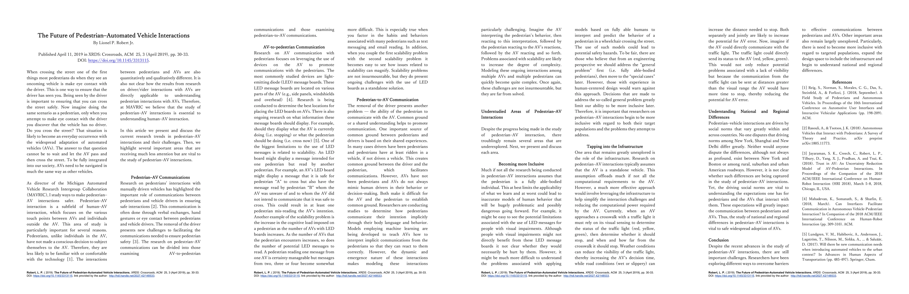 While the increasing popularity of autonomous vehicles has garnered critical media attention, less has been written about the field of pedestrian-automated vehicle interactions and its challenges. Current research trends are discussed as well as several areas receiving much less attention, but are still vital to the field.