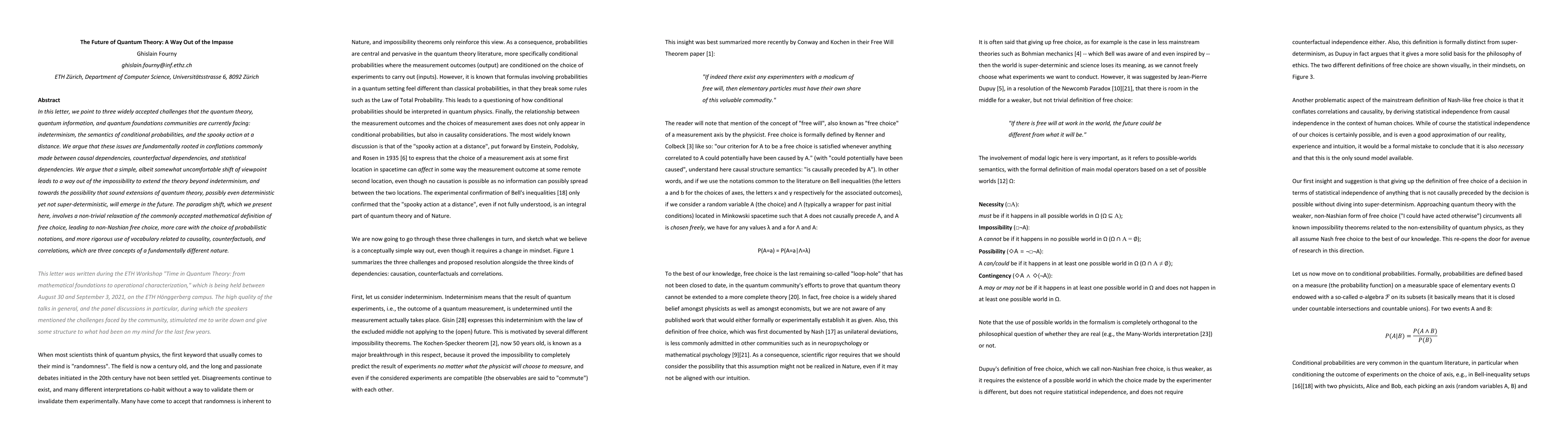 In this letter, we point to three widely accepted challenges that the quantum theory, quantum information, and quantum foundations communities are currently facing: indeterminism, the semantics of conditional probabilities, and the spooky action at a distance. We argue that these issues are fundamentally rooted in conflations commonly made between causal dependencies, counterfactual dependencies, and statistical dependencies. We argue that a simple, albeit somewhat uncomfortable shift of viewpoint leads to a way out of the impossibility to extend the theory beyond indeterminism, and towards the possibility that sound extensions of quantum theory, possibly even deterministic yet not super-deterministic, will emerge in the future. The paradigm shift, which we present here, involves a non-trivial relaxation of the commonly accepted mathematical definition of free choice, leading to non-Nashian free choice, more care with the choice of probabilistic notations, and more rigorous use of vocabulary related to causality, counterfactuals, and correlations, which are three concepts of a fundamentally different nature.