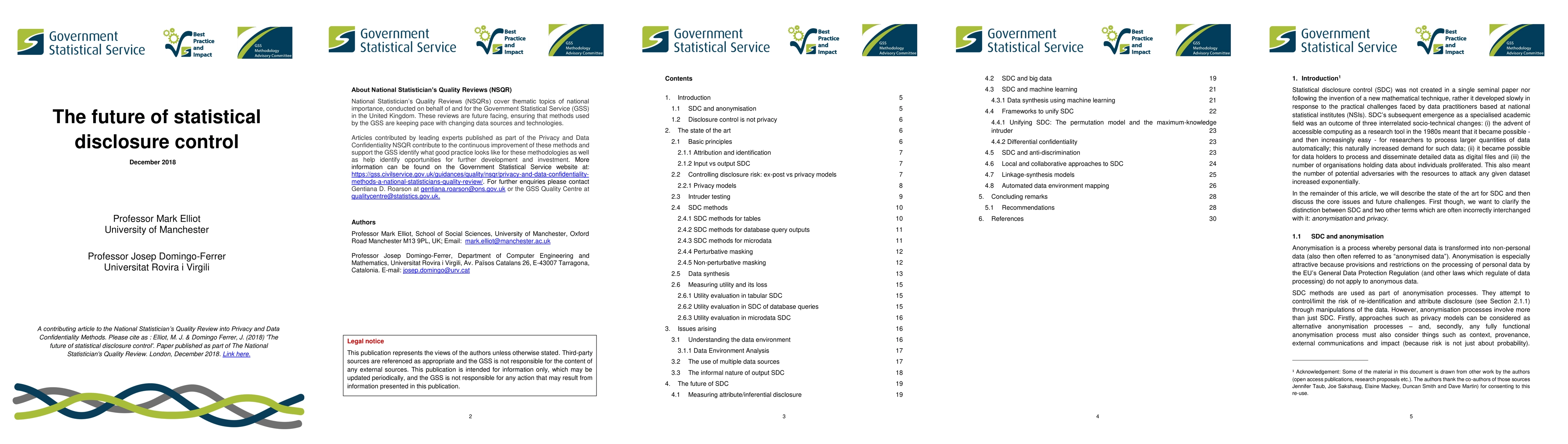 Statistical disclosure control (SDC) evolved as a response to growing data complexity and security threats, with emerging technologies like computing power and digital data dissemination driving demand for its development. The paper discusses the state of SDC, challenges, and future issues, including its intersection with big data, machine learning, and anti-discrimination.