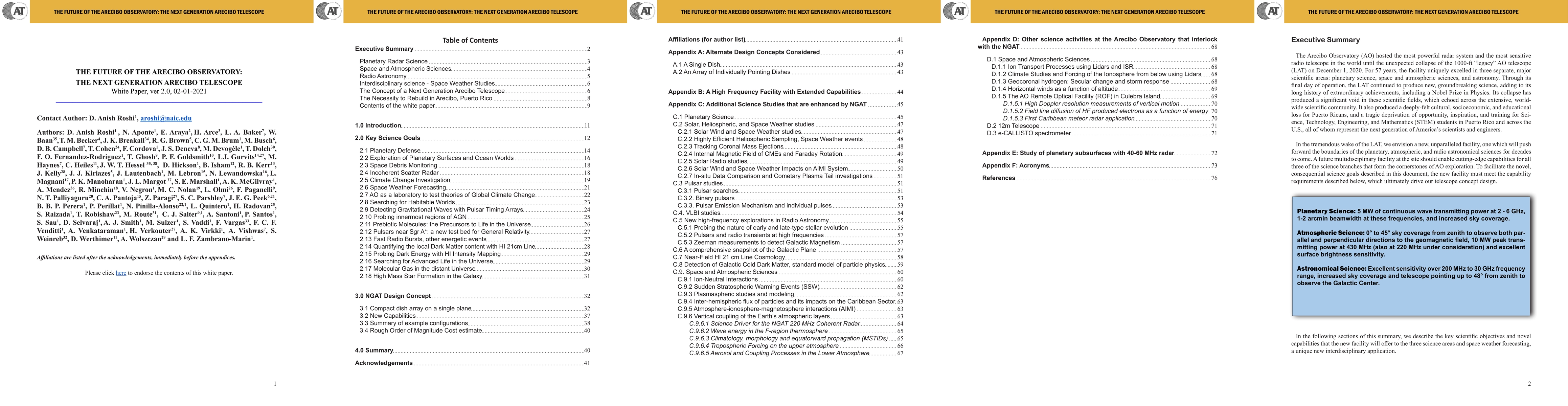 The Arecibo Observatory (AO) is a multidisciplinary research and education facility that is recognized worldwide as a leading facility in astronomy, planetary, and atmospheric and space sciences. AO's cornerstone research instrument was the 305-m William E. Gordon telescope. On December 1, 2020, the 305-m telescope collapsed and was irreparably damaged. In the three weeks following the collapse, AO's scientific and engineering staff and the AO users community initiated extensive discussions on the future of the observatory. The community is in overwhelming agreement that there is a need to build an enhanced, next-generation radar-radio telescope at the AO site. From these discussions, we established the set of science requirements the new facility should enable. These requirements can be summarized briefly as: 5 MW of continuous wave transmitter power at 2 - 6 GHz, 10 MW of peak transmitter power at 430 MHz (also at 220MHz under consideration), zenith angle coverage 0 to 48 deg, frequency coverage 0.2 to 30 GHz and increased Field-of-View. These requirements determine the unique specifications of the proposed new instrument. The telescope design concept we suggest consists of a compact array of fixed dishes on a tiltable, plate-like structure with a collecting area equivalent to a 300m dish. This concept, referred to as the Next Generation Arecibo Telescope (NGAT), meets all of the desired specifications and provides significant new science capabilities to all three research groups at AO. This whitepaper presents a sample of the wide variety of the science that can be achieved with the NGAT, the details of the telescope design concept and the need for the new telescope to be located at the AO site. We also discuss other AO science activities that interlock with the NGAT in the white paper.