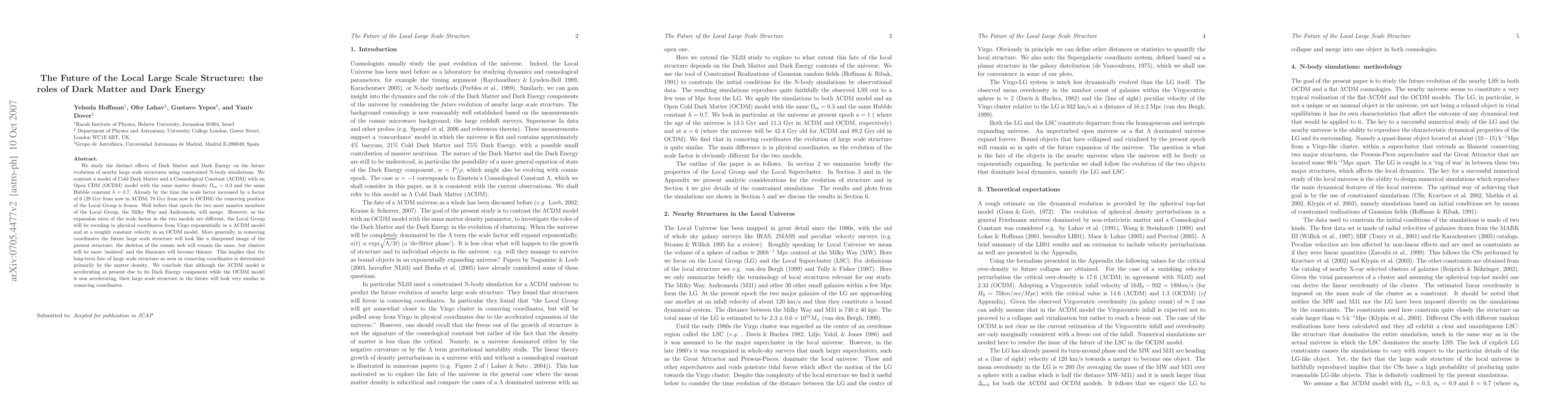 We study the distinct effects of Dark Matter and Dark Energy on the future evolution of nearby large scale structures using constrained N-body simulations. We contrast a model of Cold Dark Matter and a Cosmological Constant (LCDM) with an Open CDM (OCDM) model with the same matter density Omega_m =0.3 and the same Hubble constant h=0.7. Already by the time the scale factor increased by a factor of 6 (29 Gyr from now in LCDM; 78 Gyr from now in OCDM) the comoving position of the Local Group is frozen. Well before that epoch the two most massive members of the Local Group, the Milky Way and Andromeda, will merge. However, as the expansion rates of the scale factor in the two models are different, the Local Group will be receding in physical coordinates from Virgo exponentially in a LCDM model and at a roughly constant velocity in an OCDM model. More generally, in comoving coordinates the future large scale structure will look like a sharpened image of the present structure: the skeleton of the cosmic web will remain the same, but clusters will be more `isolated' and the filaments will become thinner. This implies that the long-term fate of large scale structure as seen in comoving coordinates is determined primarily by the matter density. We conclude that although the LCDM model is accelerating at present due to its Dark Energy component while the OCDM model is non accelerating, their large scale structure in the future will look very similar in comoving coordinates.