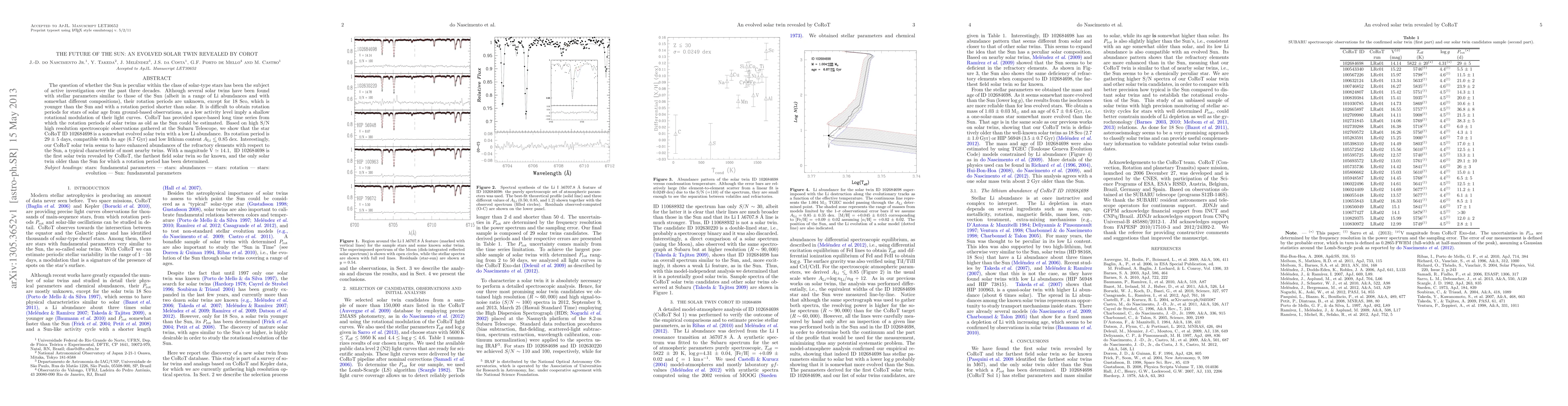 The question of whether the Sun is peculiar within the class of solar-type stars has been the subject of active investigation over the past three decades. Although several solar twins have been found with stellar parameters similar to those of the Sun (albeit in a range of Li abundances and with somewhat different compositions), their rotation periods are unknown, except for 18 Sco, which is younger than the Sun and with a rotation period shorter than solar. It is difficult to obtain rotation periods for stars of solar age from ground-based observations, as a low activity level imply a shallow rotational modulation of their light curves. CoRoT has provided space-based long time series from which the rotation periods of solar twins as old as the Sun could be estimated. Based on high S/N high resolution spectroscopic observations gathered at the Subaru Telescope, we show that the star CoRoT ID 102684698 (CoRoT Sol 1) is a somewhat evolved solar twin with a low Li abundance. Its rotation period is 29 +- 5 days, compatible with its age (6.7 Gyr) and low lithium content A(Li) < 0.85 dex. Interestingly, our CoRoT solar twin seems to have enhanced abundances of the refractory elements with respect to the Sun, a typical characteristic of most nearby twins. With a magnitude V ~14.1, ID 102684698 is the first solar twin revealed by CoRoT, the farthest field solar twin so far known, and the only solar twin older than the Sun for which a rotation period has been determined.