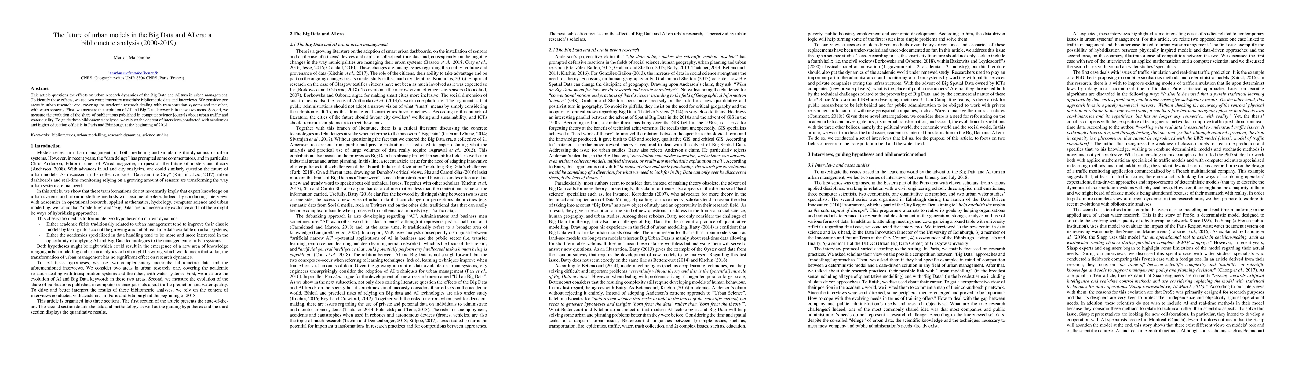 The study uses a bibliometric analysis of Web of Science (WoS) data from 2000-2019, focusing on transportation and water systems research, to assess the impact of Big Data and AI on urban research dynamics. Interviews with academics and higher education officials in Paris and Edinburgh guide this analysis.