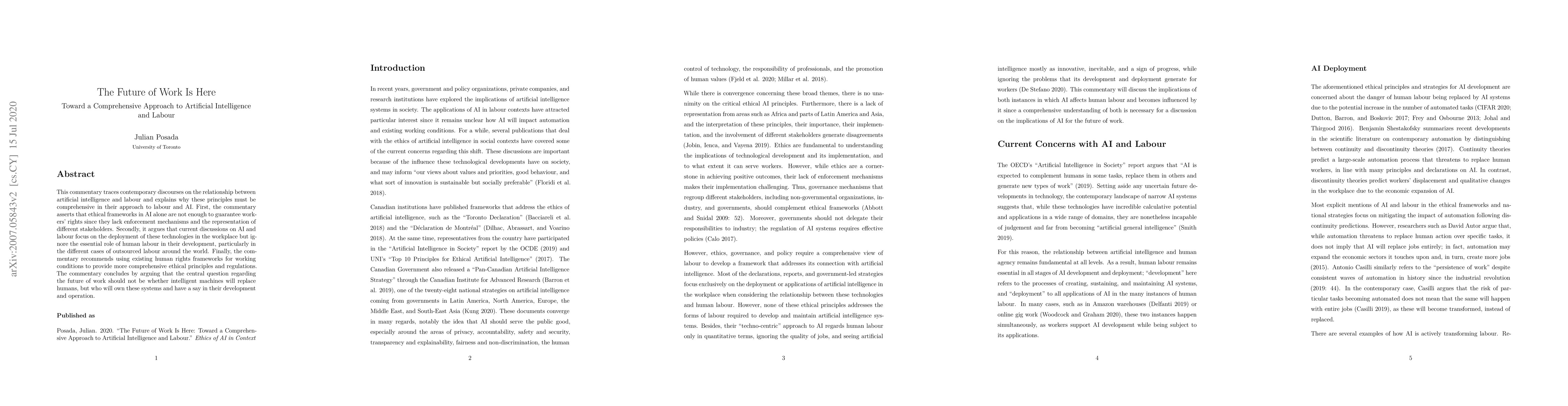This commentary traces contemporary discourses on the relationship between artificial intelligence and labour and explains why these principles must be comprehensive in their approach to labour and AI. First, the commentary asserts that ethical frameworks in AI alone are not enough to guarantee workers' rights since they lack enforcement mechanisms and the representation of different stakeholders. Secondly, it argues that current discussions on AI and labour focus on the deployment of these technologies in the workplace but ignore the essential role of human labour in their development, particularly in the different cases of outsourced labour around the world. Finally, it recommends using existing human rights frameworks for working conditions to provide more comprehensive ethical principles and regulations. The commentary concludes by arguing that the central question regarding the future of work should not be whether intelligent machines will replace humans, but who will own these systems and have a say in their development and operation.