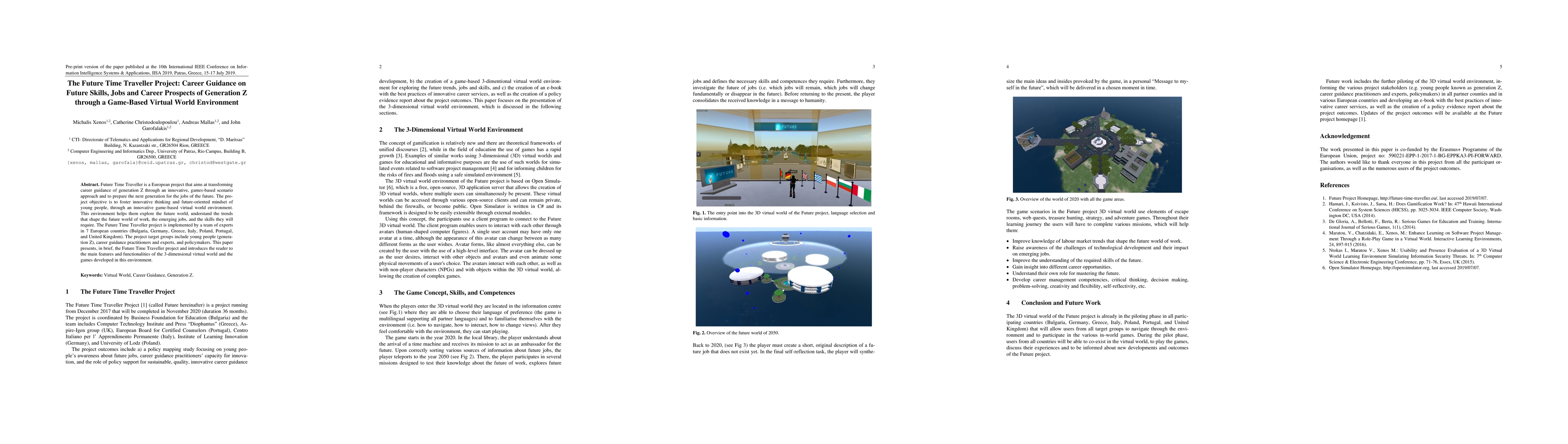 Future Time Traveller is a European project that aims at transforming career guidance of generation Z through an innovative, games-based scenario approach and to prepare the next generation for the jobs of the future. The pro-ject objective is to foster innovative thinking and future-oriented mindset of young people, through an innovative game-based virtual world environment. This environment helps them explore the future world, understand the trends that shape the future world of work, the emerging jobs, and the skills they will require. The Future Time Traveller project is implemented by a team of experts in 7 European countries (Bulgaria, Germany, Greece, Italy, Poland, Portugal, and United Kingdom). The project target groups include young people (genera-tion Z), career guidance practitioners and experts, and policymakers. This paper presents, in brief, the Future Time Traveller project and introduces the reader to the main features and functionalities of the 3-dimensional virtual world and the games developed in this environment.