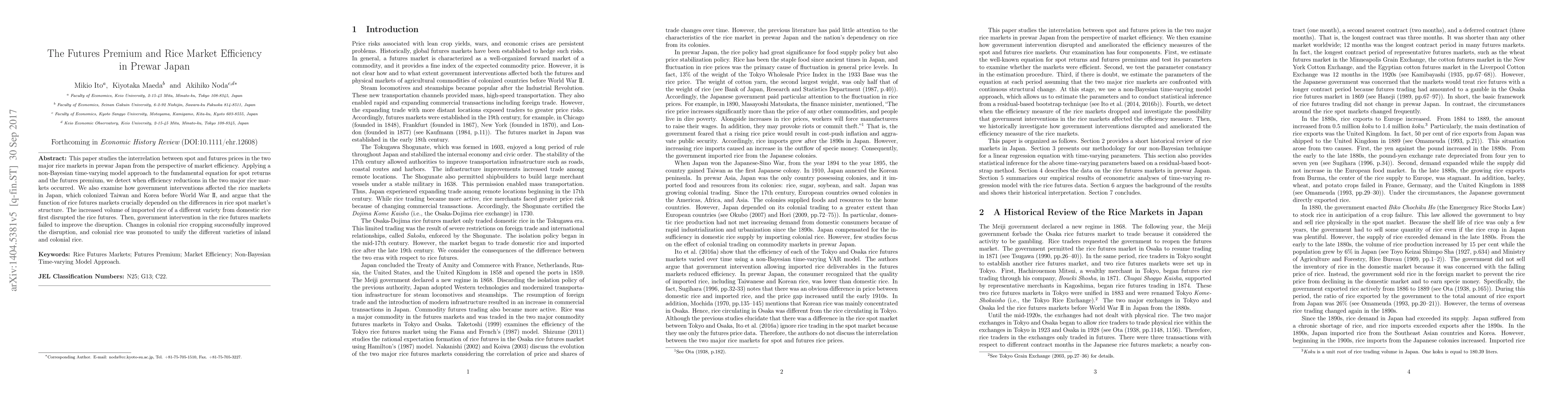 This paper investigates the efficiency of prewar Japanese rice markets by analyzing the relationship between spot and futures prices, revealing periods of reduced efficiency and the impact of government interventions. It concludes that the introduction of imported rice and subsequent government actions failed to stabilize the markets, but colonial rice policies eventually unified domestic and colonial rice varieties.