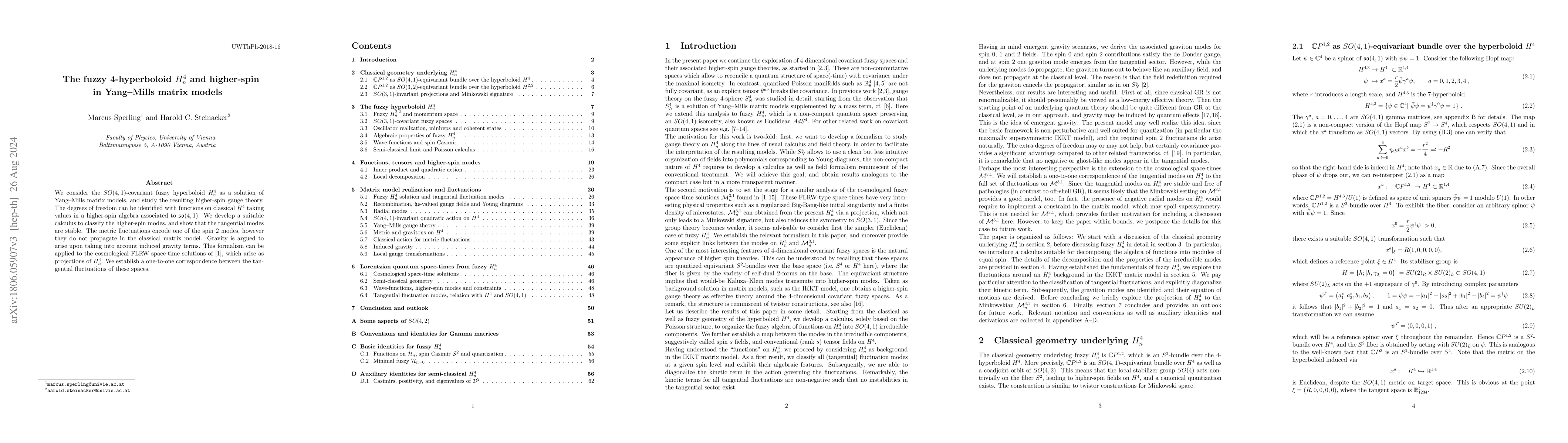 This paper explores the $SO(4,1)$-covariant fuzzy hyperboloid $H^4_n$ in Yang-Mills matrix models, identifying higher-spin gauge theories and classifying their modes. It demonstrates that tangential modes are stable and suggests gravity emerges with induced terms, linking to FLRW cosmological solutions.